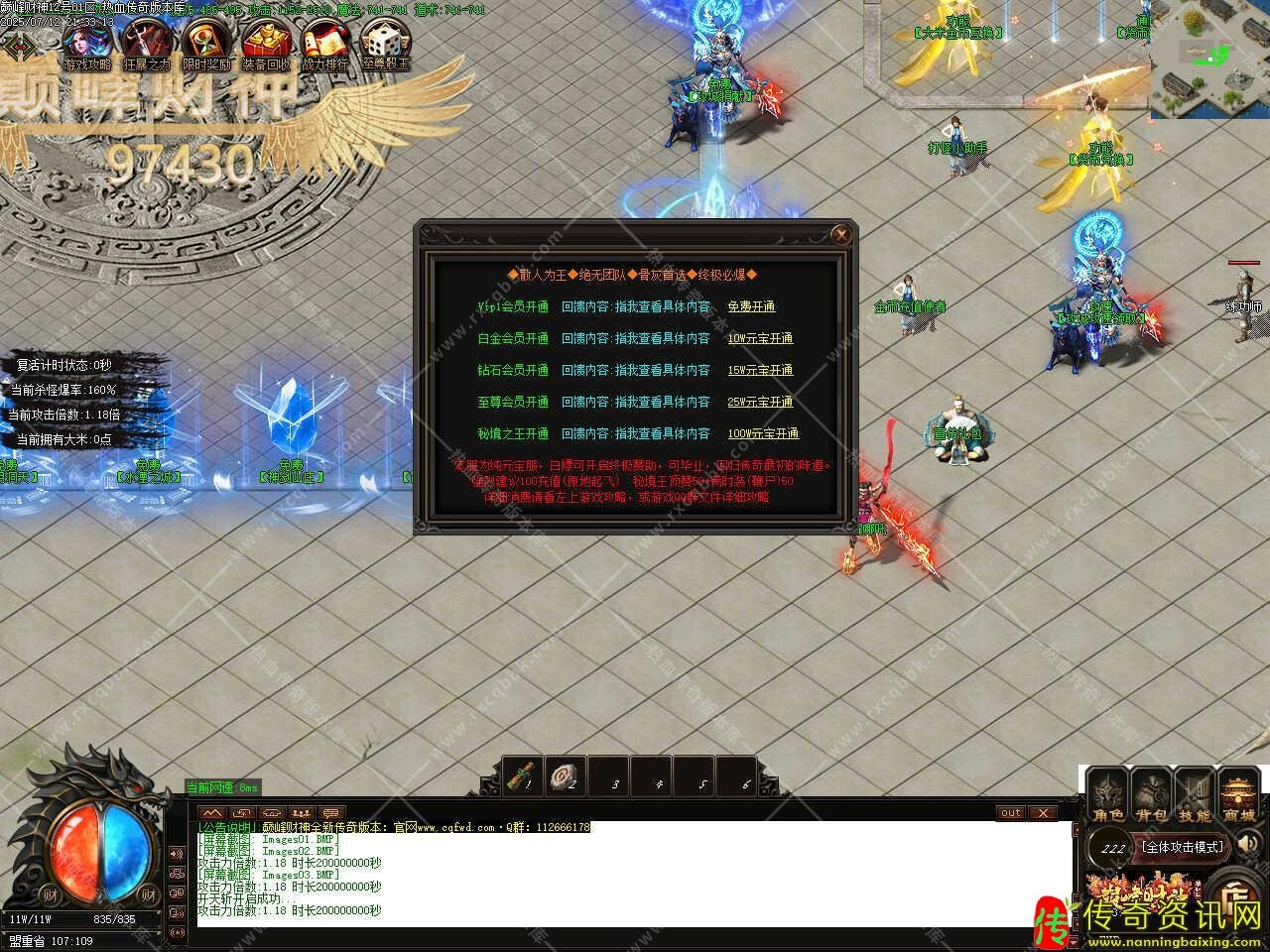 四、所有玩家上线自动开启随身泡点,只要在线任意打怪地图自动涨经验,每秒增加攻击力X20的经验,新手保底3000经验每秒;加入行会玩家额外获得20%泡点经验;神力玩家额外获得30%泡点经验;顶赞玩家额外获得30%泡点经验,以上都可累计。