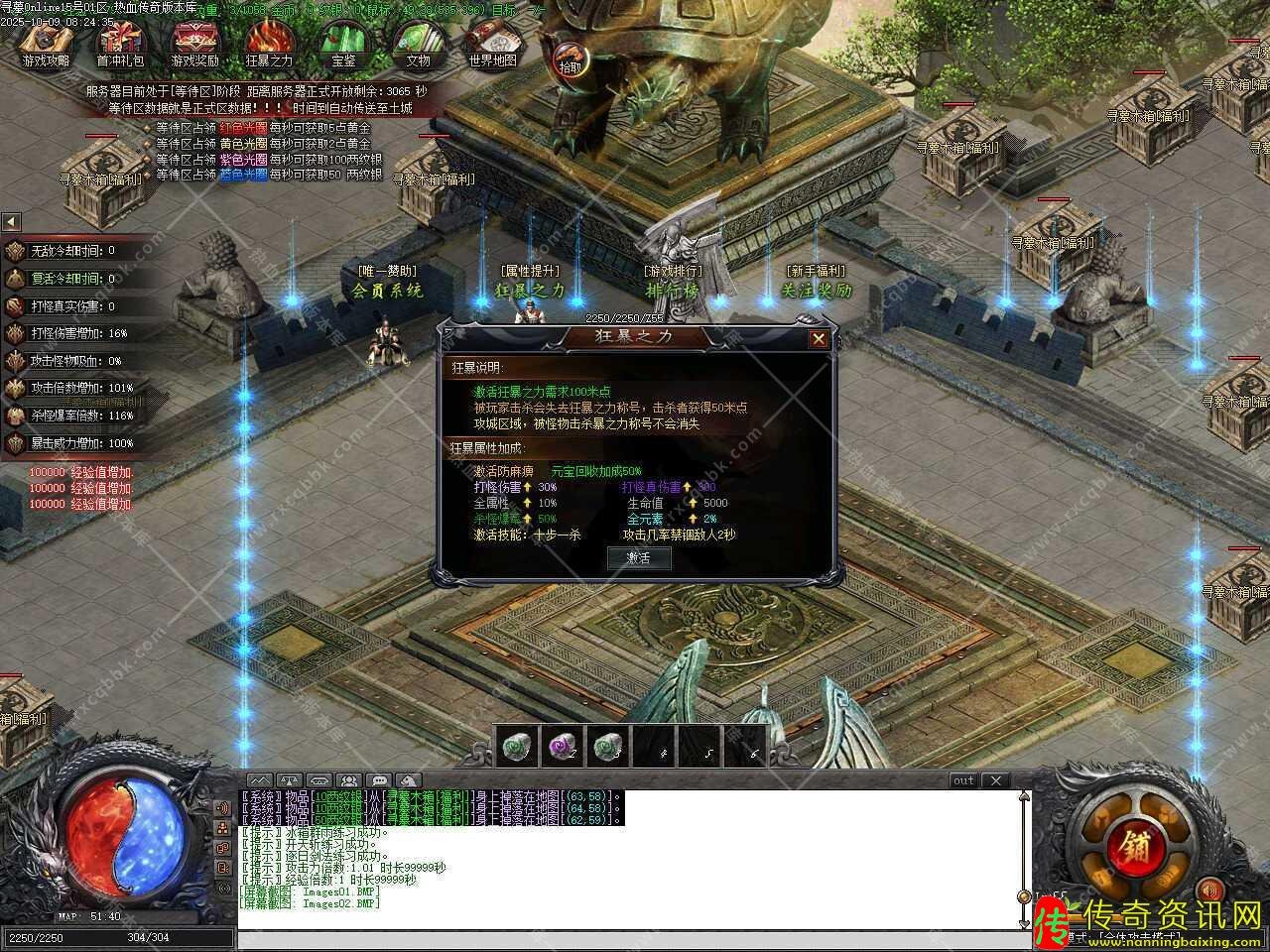四、开放狂暴之力功能,激活狂暴之力需求100游戏点,被玩家打掉后会失去狂暴之力称号,对方获得50游戏点,攻城区域,被怪物打掉,狂暴之力称号不会消失,激活元宝回收加成50%、打怪伤害增加30%、全属性增加10%、全元素增加2%,激活后可获得技能十步一杀,攻击时有机率禁锢敌人2秒。