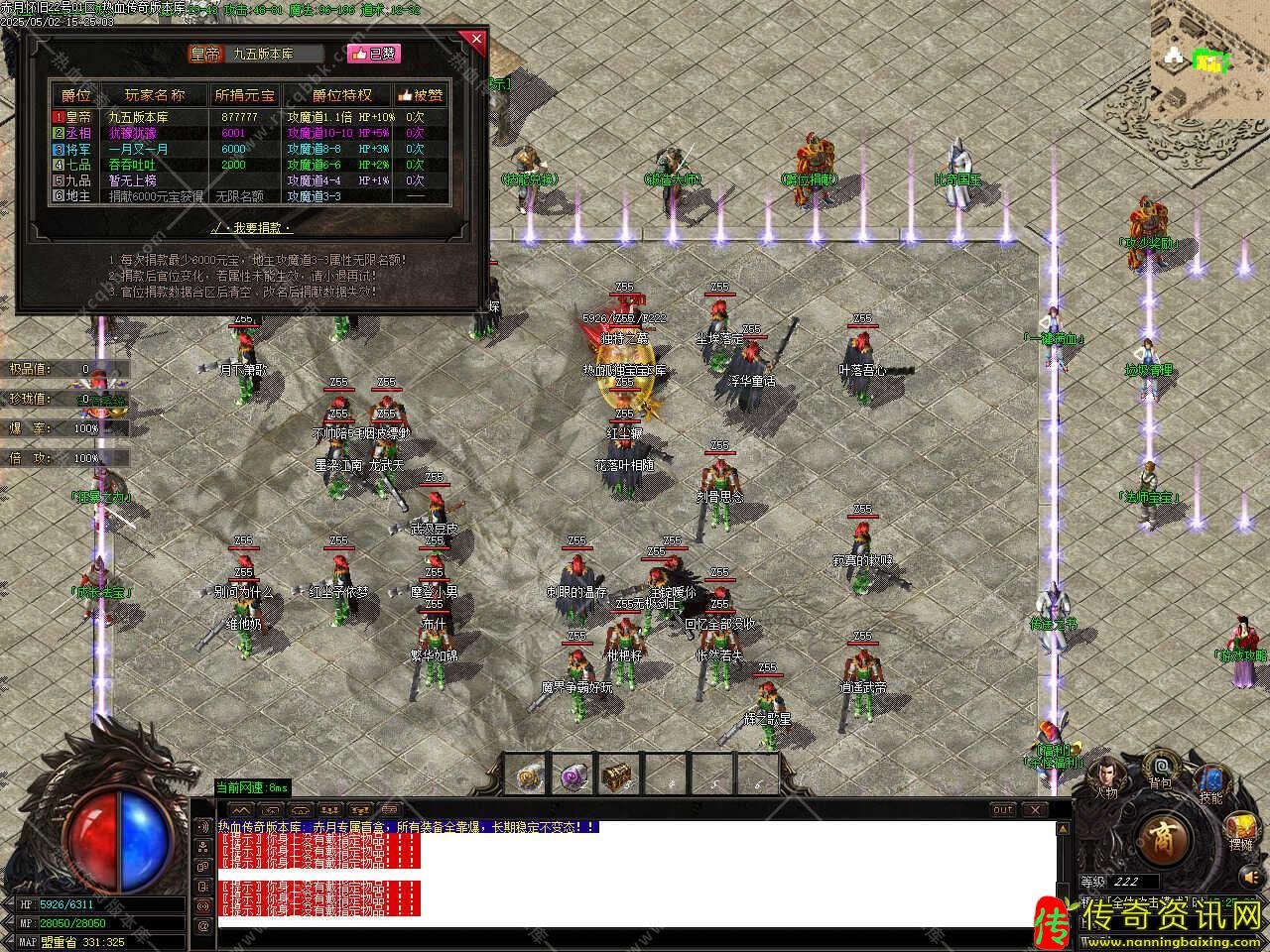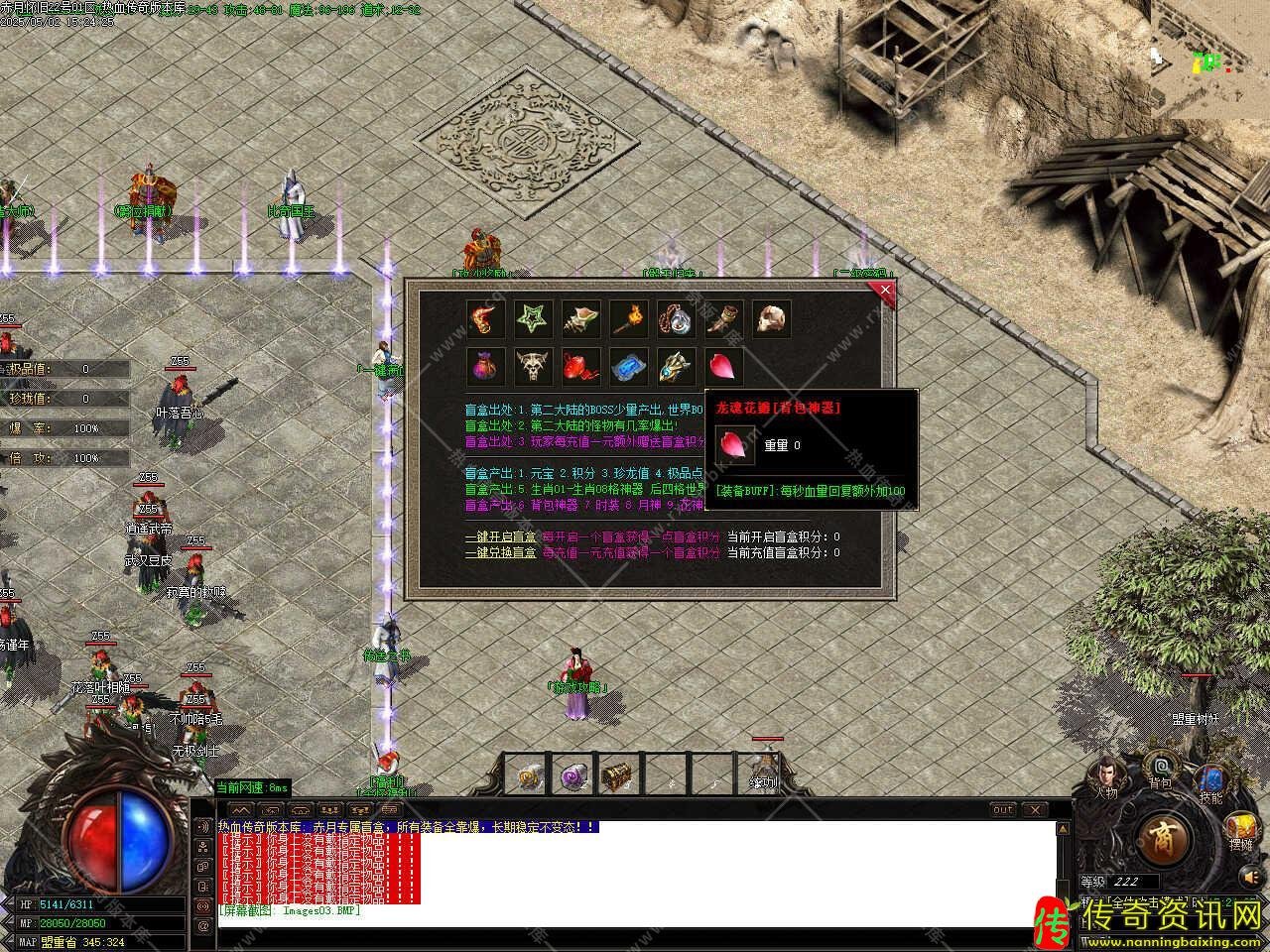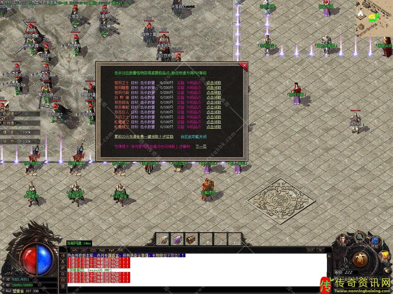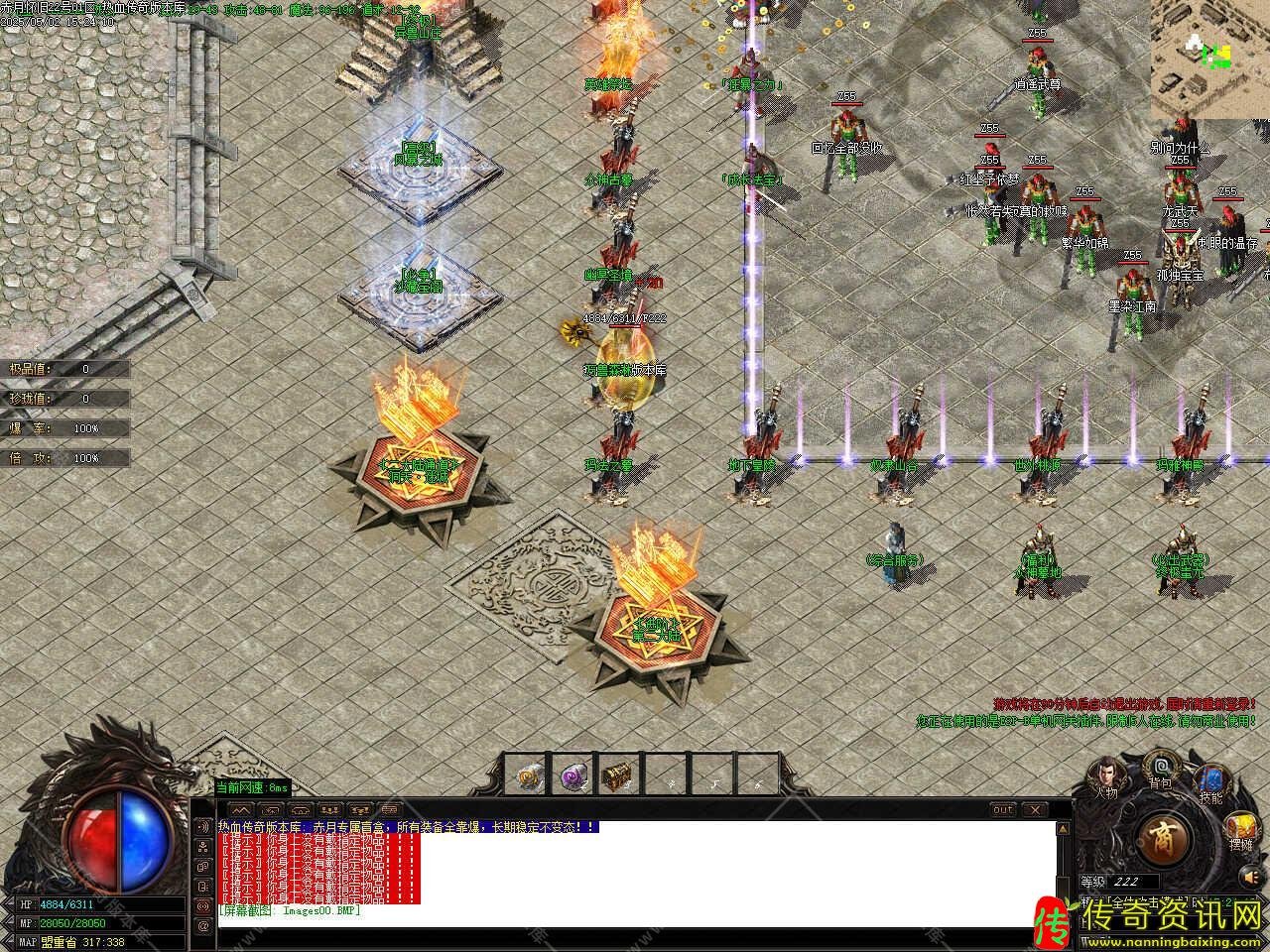 版本介绍:此传奇版本共刷新[洪荒,昊天,圣皇,伏羲]四大野外BOSS,刷新时间请关注土城(335,344)处的NPC,野外BOSS的爆率是地图BOSS的,游戏材料,高阶装备,书页元宝,是玩家必抢BOSS。