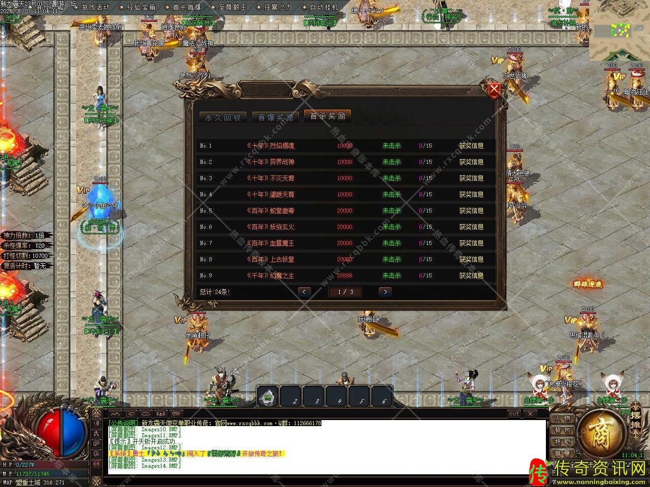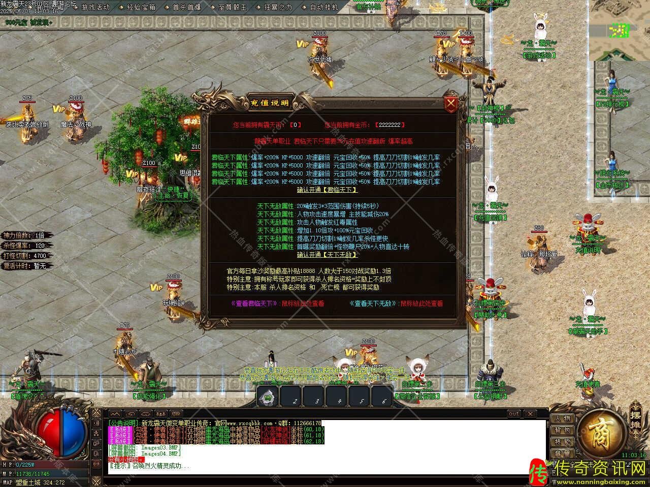 版本介绍:此传奇版本中十万血以上的怪都有几率爆终极,血越多的怪爆率越好,神器装备只有神器怪爆,下四格加斗笠特殊全靠打没有合成,任何3000万血以上怪物都出终极,全服白名字怪物见到不要放过,血少一样出终极,神器怪爆神器装备不要错过,散人多多打怪一定可以逆袭。