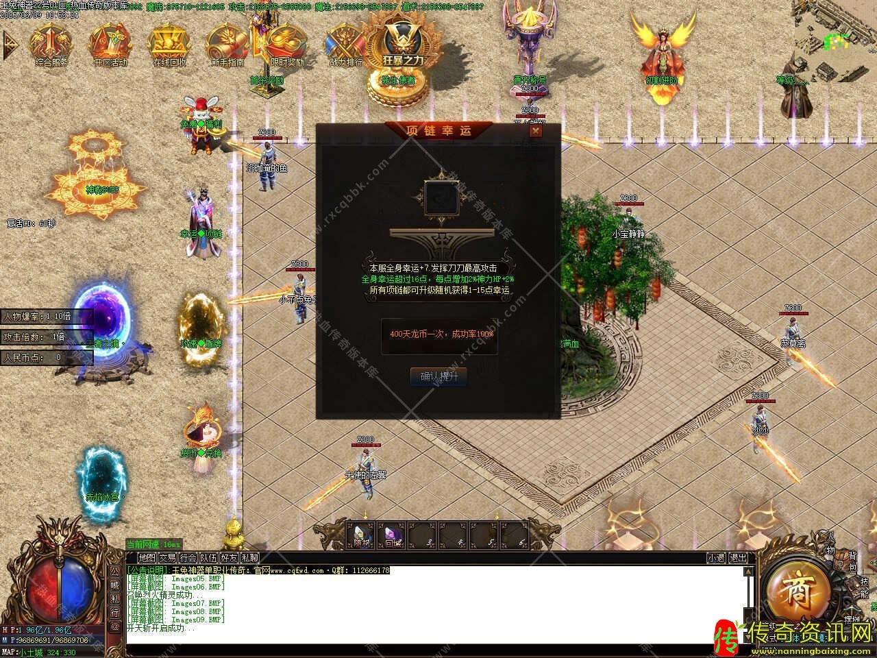 七、新增幸运大师NPC,操作时请打开NPC对话框,先放入需要改造的项链,全身幸运+7发挥刀刀最高攻击,全身幸运超过16点,每点增加2%神力HP+2%,所有项链都可升级随机获得1-15点幸运,提升一次需要400天龙币,成功率100%。