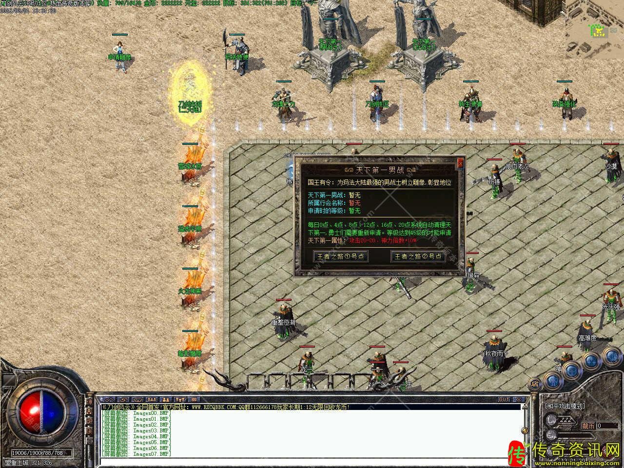 版本介绍:新增宝藏之地地图,间隔36小时刷新一只龙王,打掉宝藏之地的龙王最低掉落橙装一件,有几率掉落红装!准备好的勇士我可以带你去看看!但你需要准备100W金币、200元宝并开启狂暴才能进去。