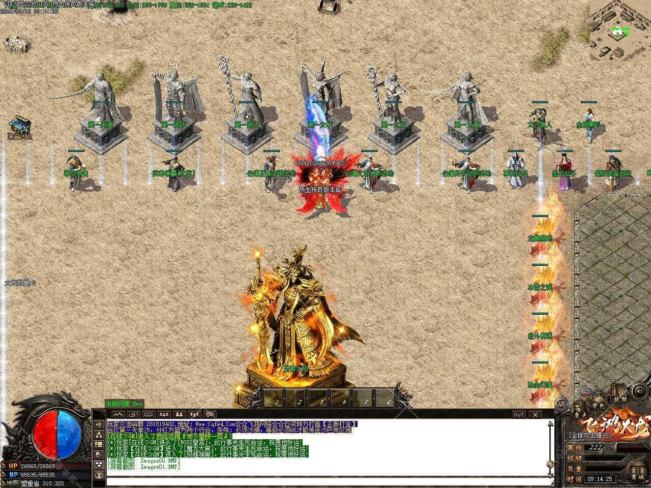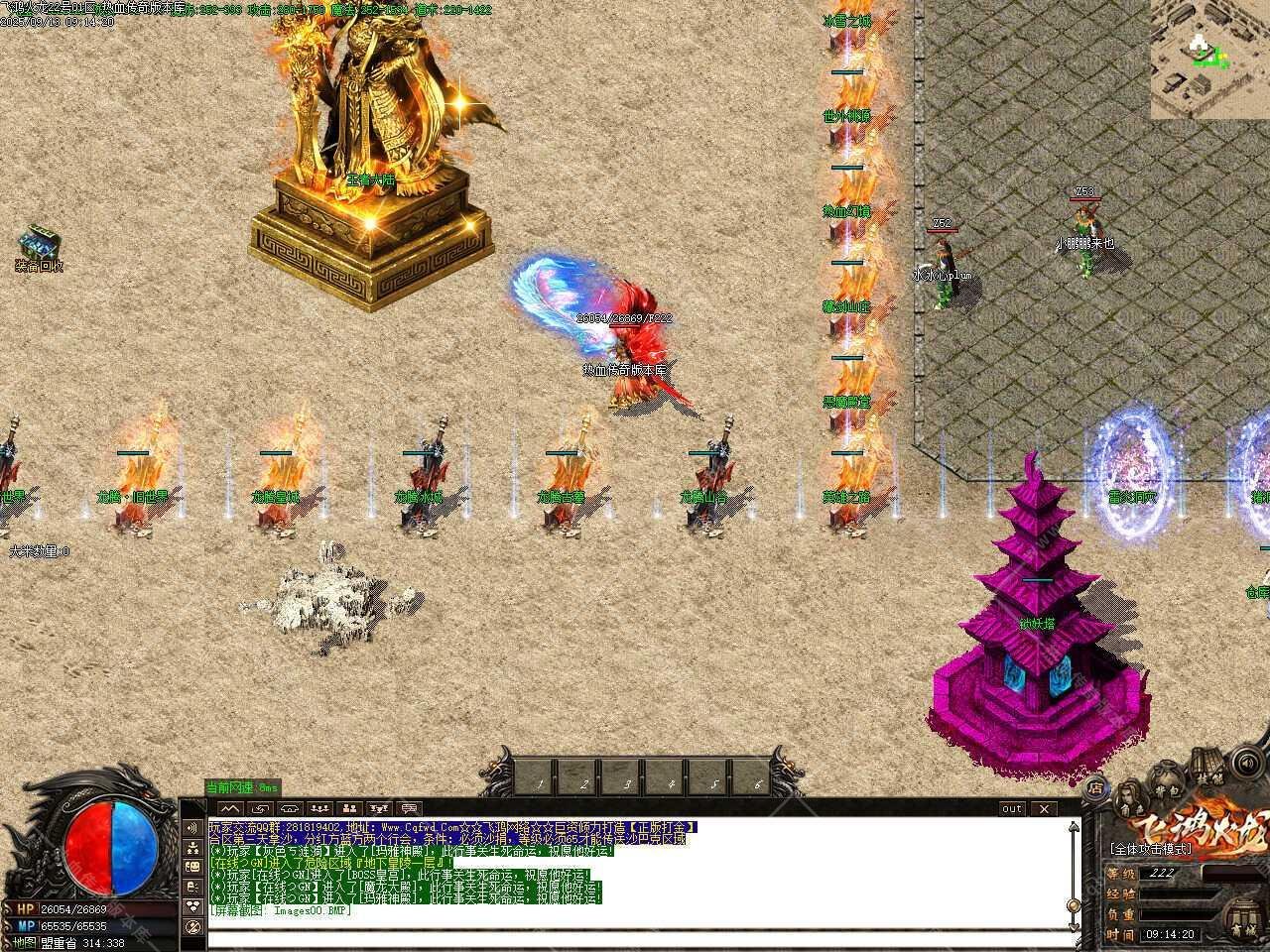 三、添加九九重天活动,开区3小时后开启2小时,活动时间截止即为结束,玩家消耗1大米随机进入1-100层,需要开启狂暴,沙捐,每次进入增进100W经验,地图怪物金刚石爆率高,100层刷新世界BOSS,必出龙腾装备很大几率出飞鸿系列装备。