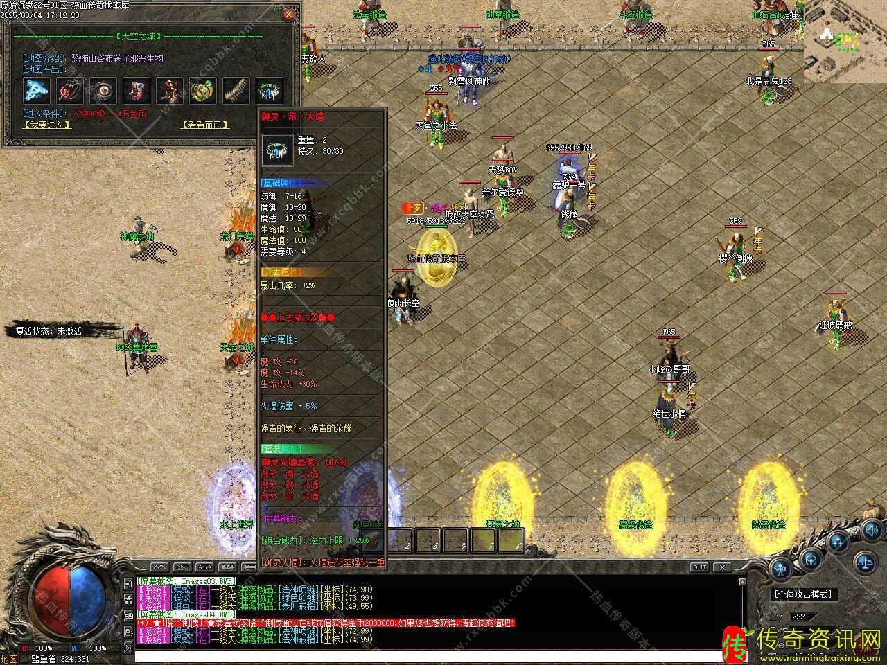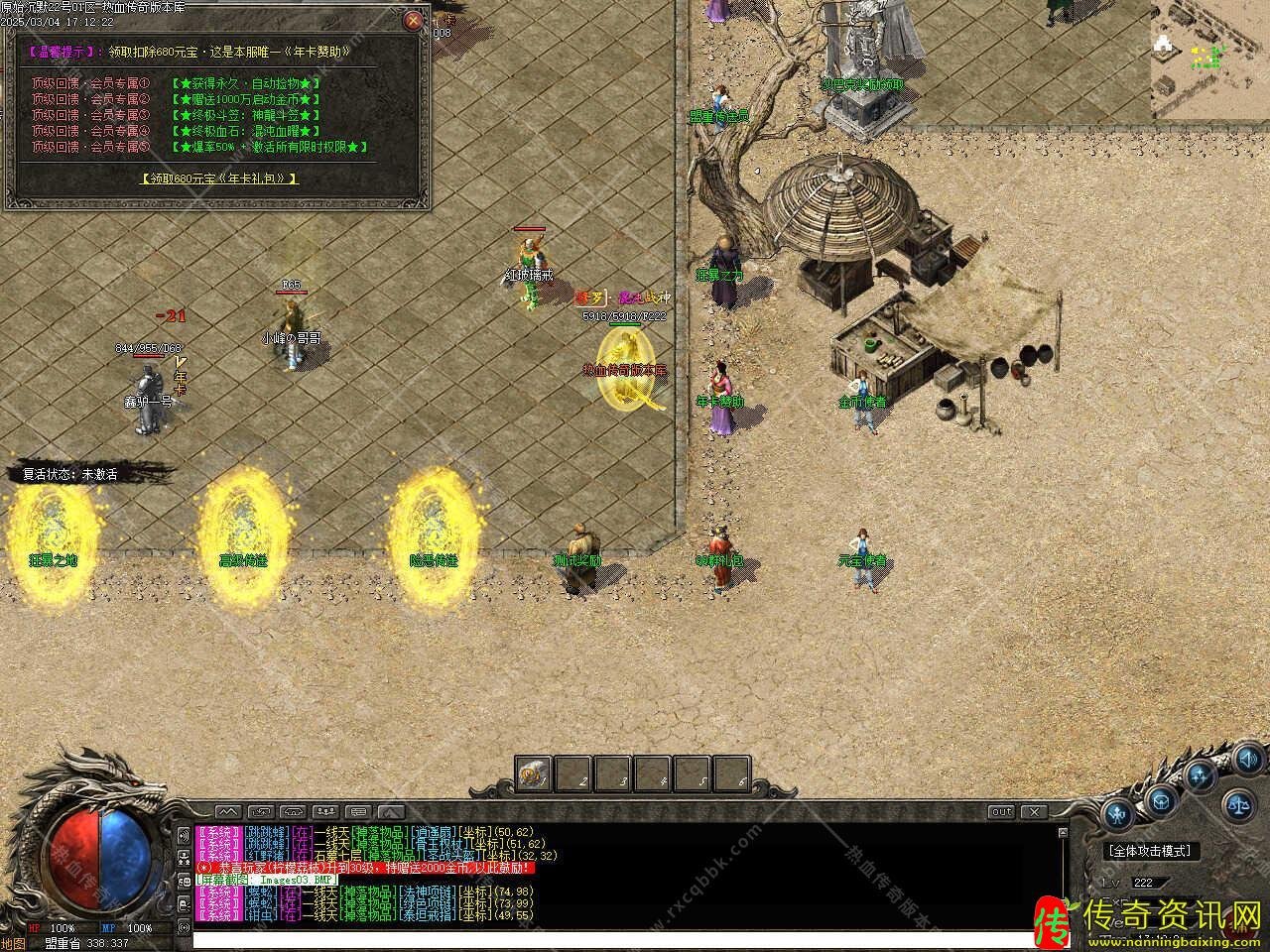 版本介绍:新增世界BOSS活动,每天10.10、16.10、22.10将会降临在苍月岛!刷新坐标:156 164,世界BOSS降临将会全服提示,几率掉落守护斩,注意:开启全服信息过滤后将无法看到刷新提示信息。 本帖最后由 传奇版本库 于 2025-3-4 20:35 编辑
