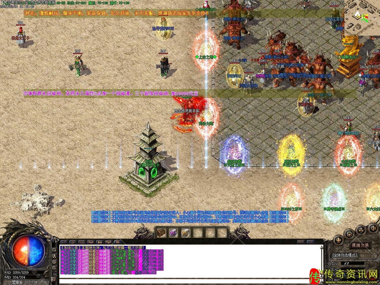 版本介绍:为丰富游戏乐趣,新增行会争霸活动,地图地图刷新精英教主,二分之一爆出传说剑甲,同时还刷新2只上古蛟龙,超高几率爆加星宝石。