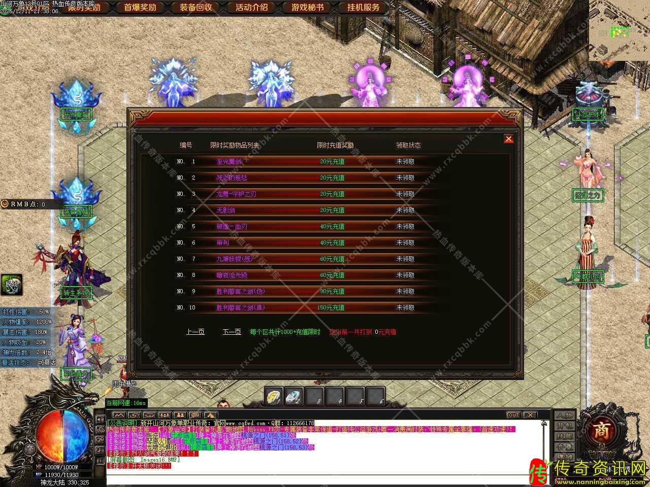 二.新增测试奖励功能,在测试区打到限时奖励获得的游戏点可以记录,记录不限制次数!记录1元限时开区后便可以获得10000元宝+1积分奖励,在测试区一定要在NPC那记录测试区限时,如无记录则开区无法领取。