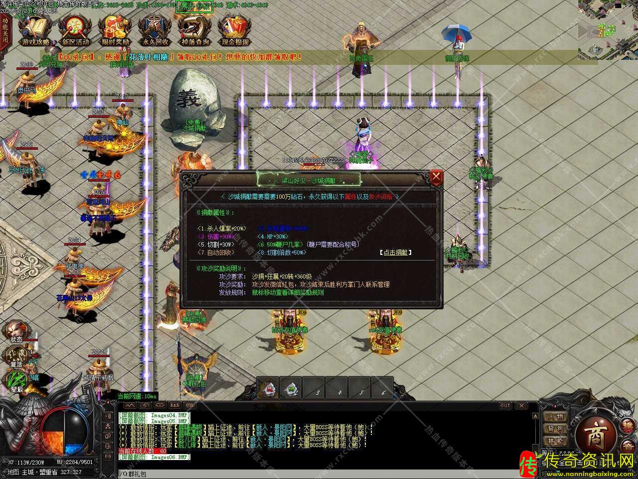 三、土城左上角锻造“聚义宝珠”,充值数量越高爆率越高,自行探索,激活“沙城捐献”拥有超强BUFF属性,尤其是【星辰切割翻倍及额外增加50%BUFF几率】,本服选择性赞助“最高500”可激活相应的符文BUFF。