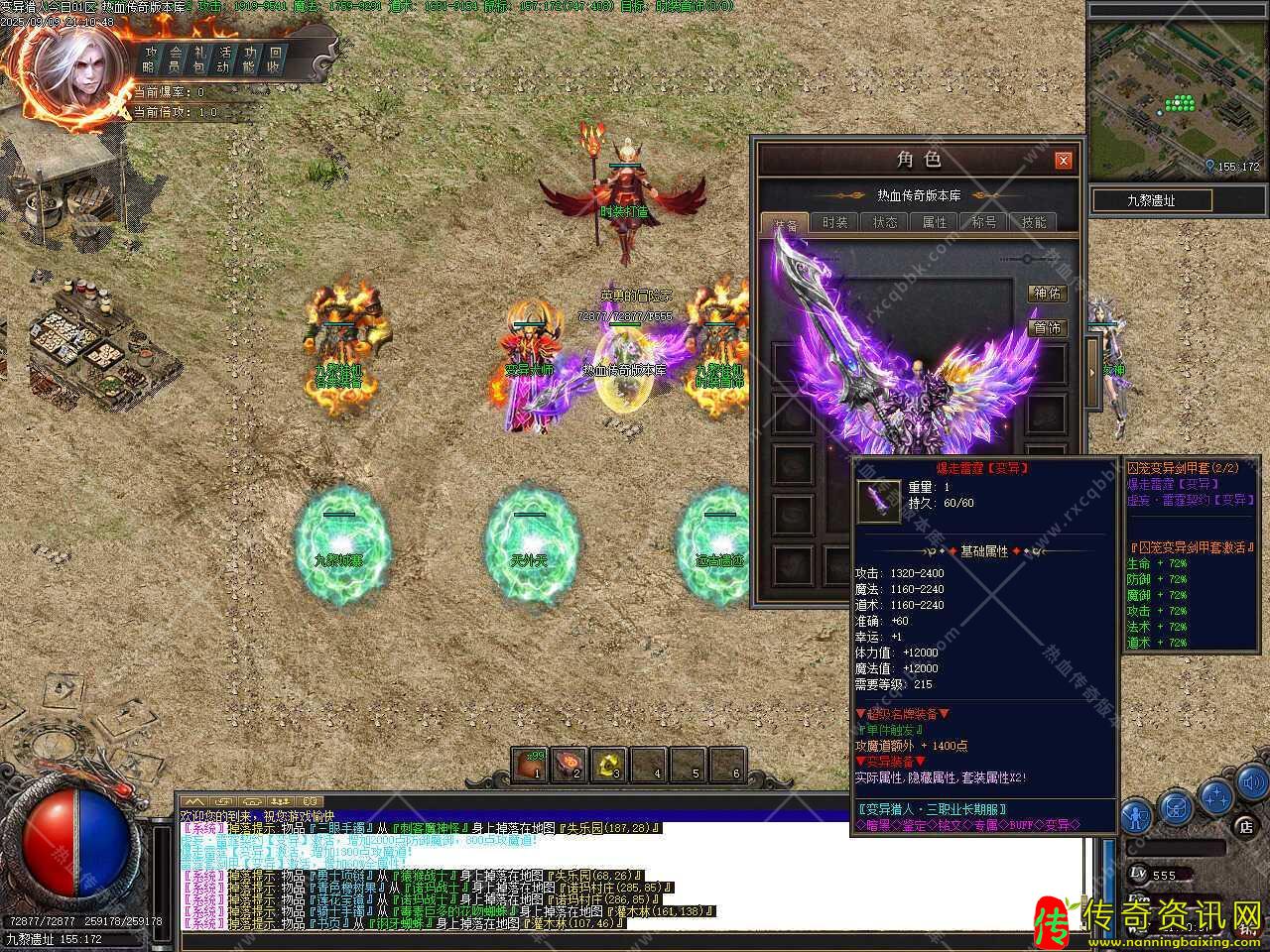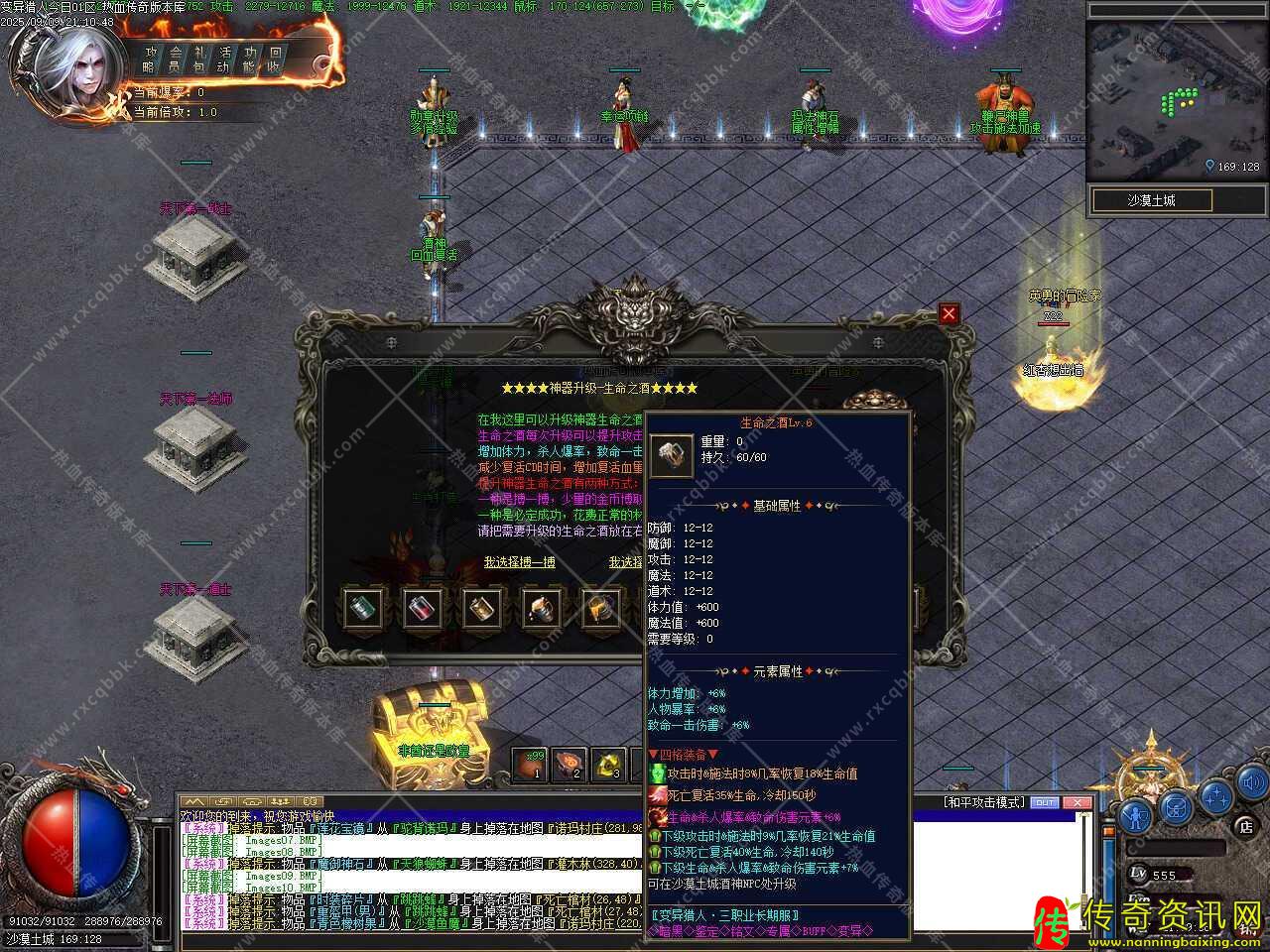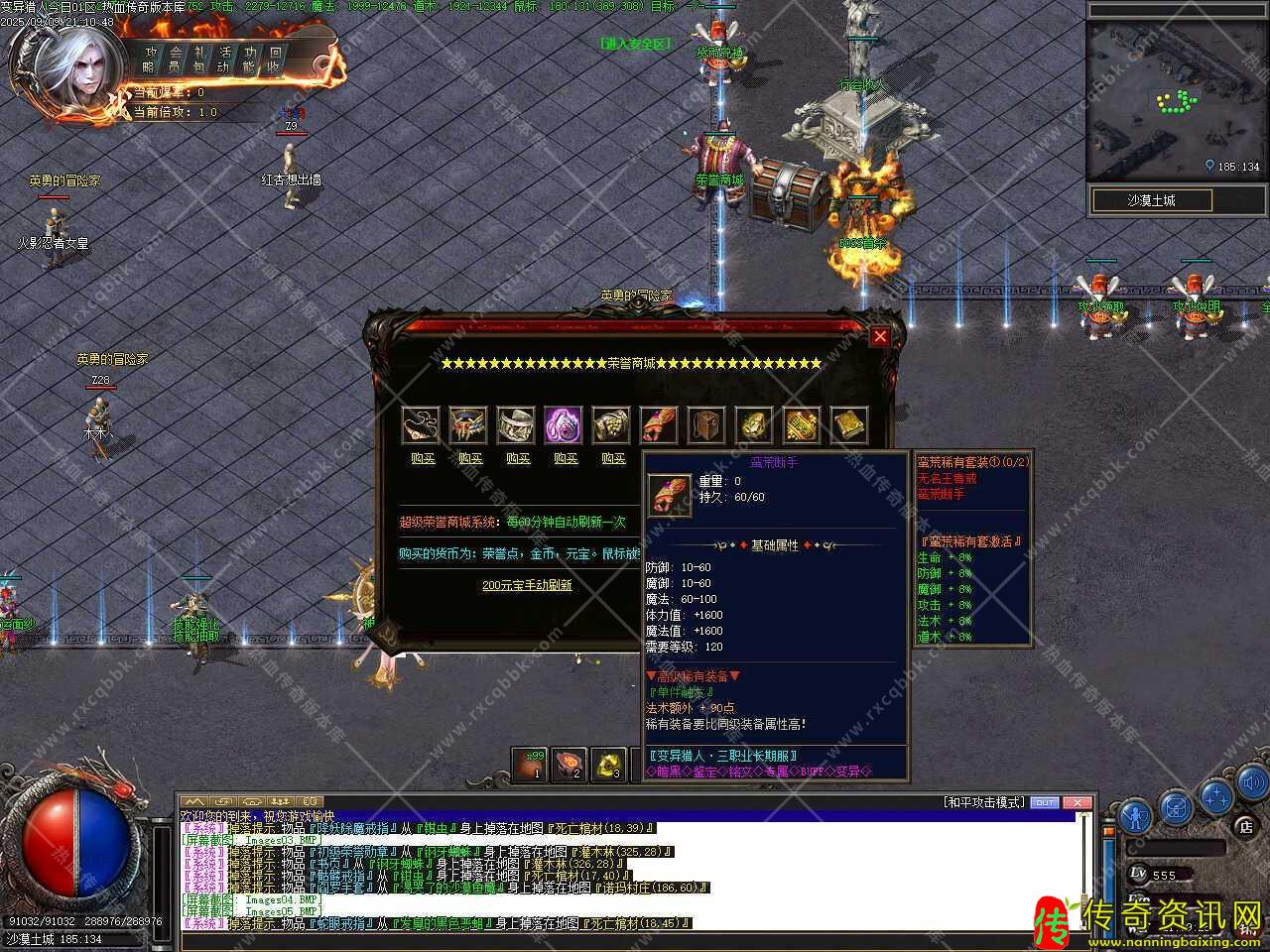 三、新增装备变异功能,变异规则:相同2件没有变异的装备可以在我这里变异,首饰盒,生肖,特殊4格不可变异.只能变异图片显示的装备.3种变异方法如下:【免费变异】2个相同的装备+30个变异石+600荣誉点,成功率40%。失败装备破碎消失。【金币变异】2个相同的装备+40个变异石+5000W金币+1200荣誉点,成功率65%。失败装备破碎消失。【元宝变异】2个相同的装备+50个变异石+15000元宝+2000荣誉点,成功率100%。不会失败。注:装备变异后【初始属性*2,隐藏属性*2,套装属性*2】!装备变异后扔地上重新拾取后就有鉴定属性!