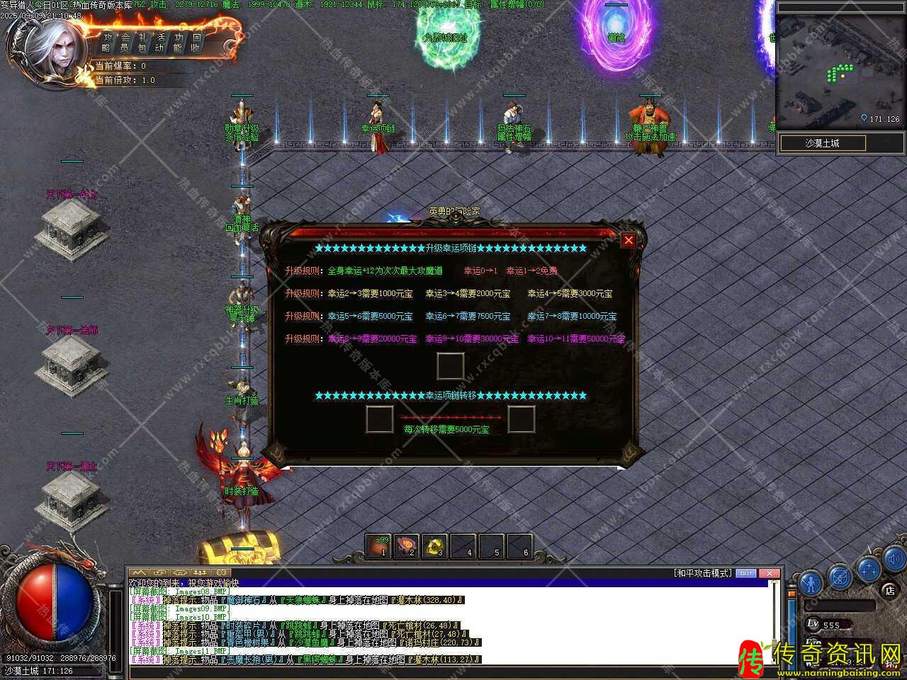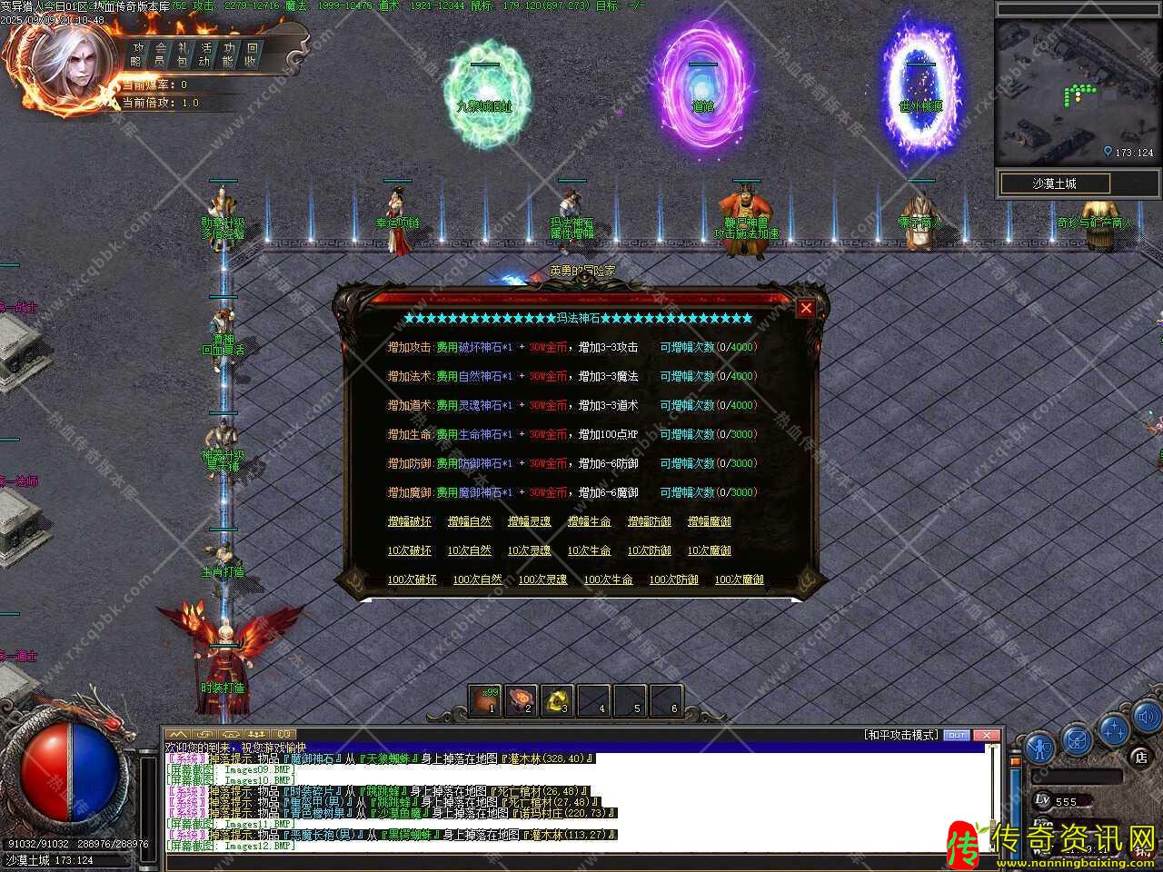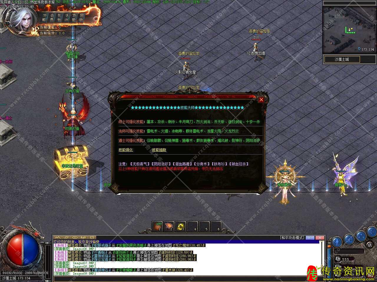 四、新增技能强化功能,战士可强化技能有基本、攻杀、刺杀、半月弯刀、烈火剑法、开天斩、逐日剑法、十步一杀;法师可强化技能有雷电术、火墙、冰咆哮、群体雷电术、流星火雨、火龙烈炎;道士可强化技能有召唤骷髅、召唤神兽、施毒术、群体施毒术、飓风破、裂神符、阴阳法环,技能强化需要消耗30书页+10W金币,注意:【无极真气】【阴阳法环】【凝血离魂】【分身术】【铁布衫】【破血狂杀】以上6种技能只有在诺玛遗址爆出或者荣誉商店兑换,书页无法直接兑出。