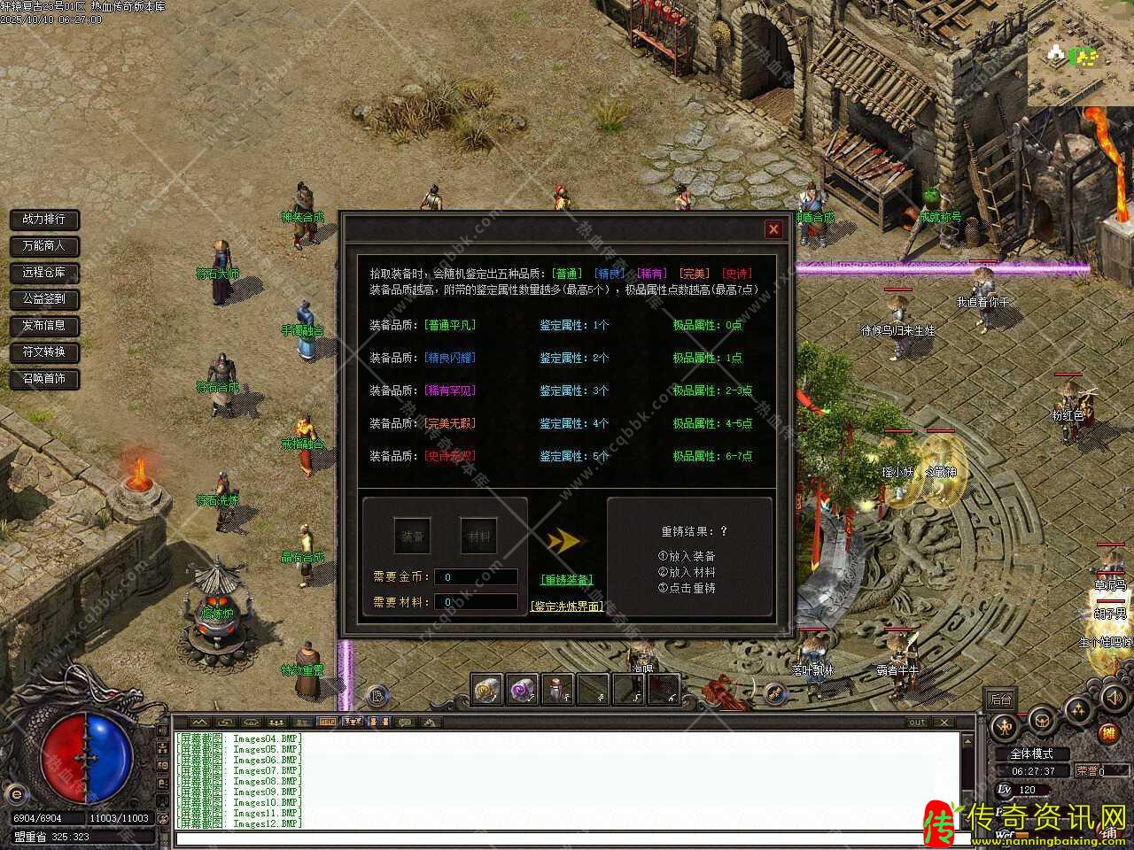 七、装备品质与鉴定,品质分级:装备捡取时随机鉴定为普通、精良、稀有、完美、史诗五种品质,史诗级装备属性最强。查看方式:前往土城NPC“装备重铸”(坐标325,319)可查看装备品质及基础属性。