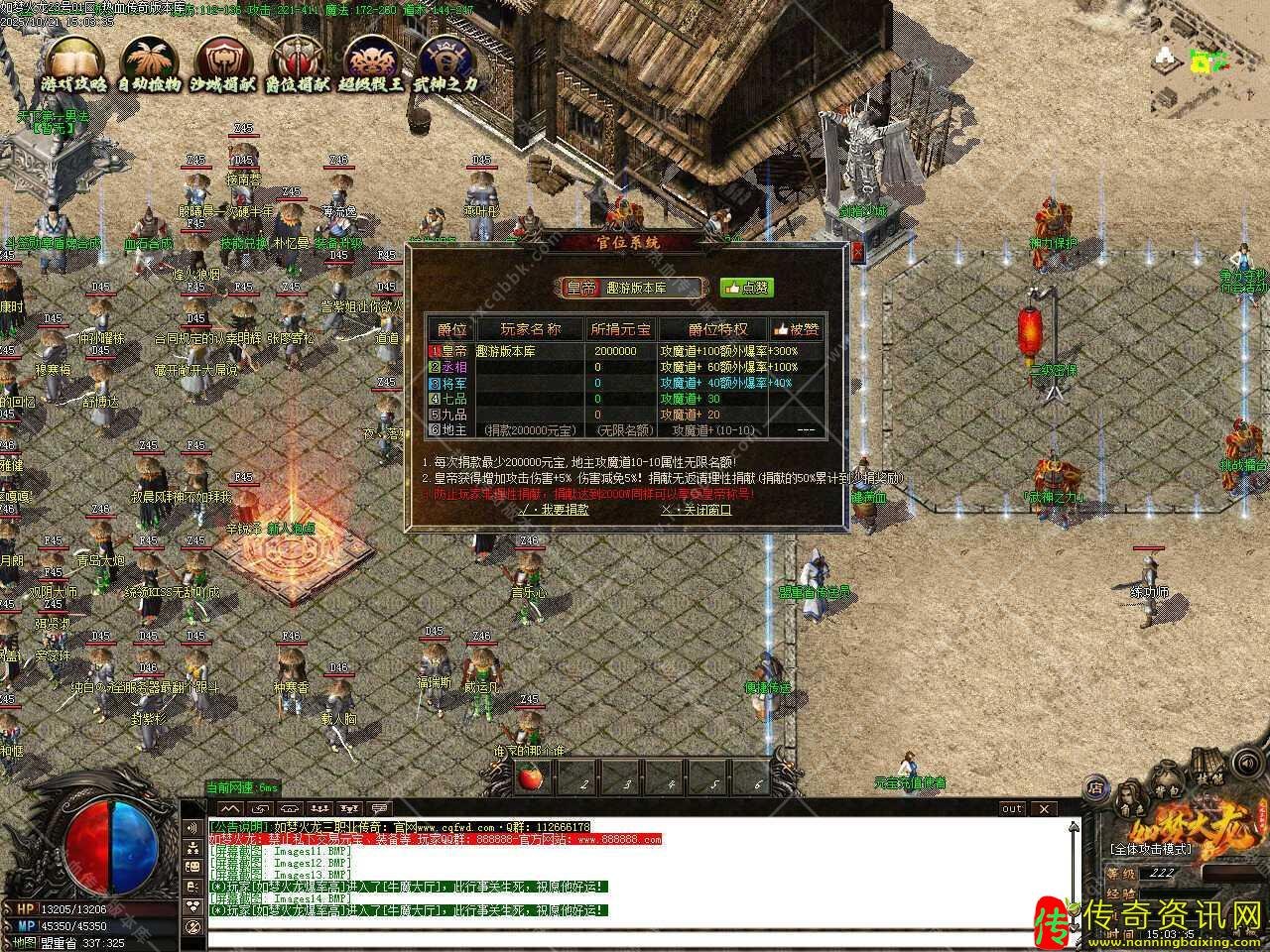 四.此服务端中新增全服喇叭功能,玩家可以全服发布信息,此信息显示在屏幕正中间,从右向左飘出,全服都能看见!高端大气上档次,为了防止刷屏,每次喊话需要1000元宝。