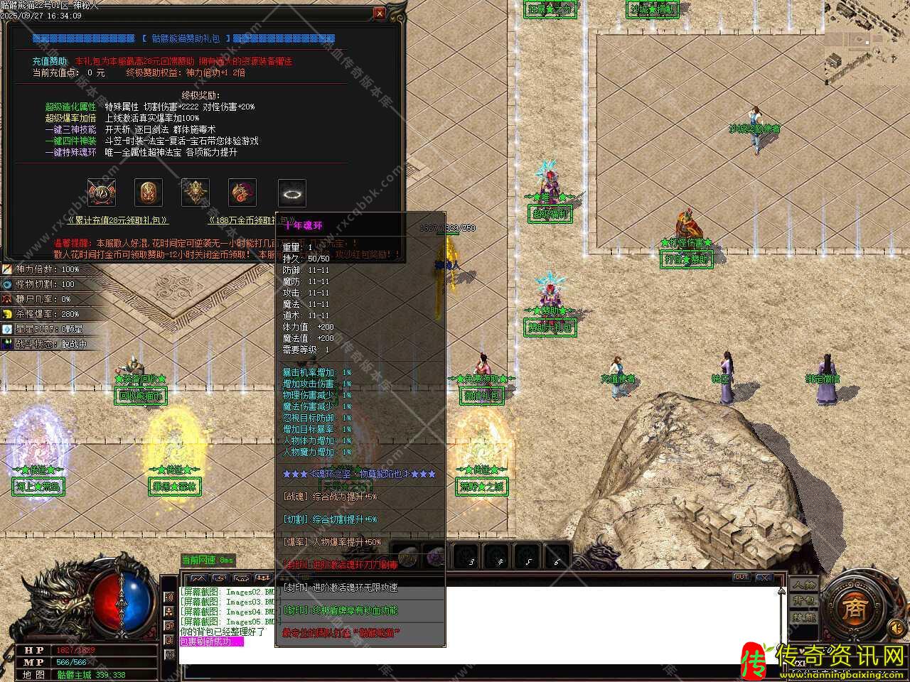 六、新增赞助礼包功能,本礼包为本服最高28回馈赞助,拥有强大的资源装备赠送,上线激活真实爆率加100%,特殊属性 切割伤害+2222 对怪伤害+20%,一键特殊魂环,唯一全属性超神法宝,各项能力提升。