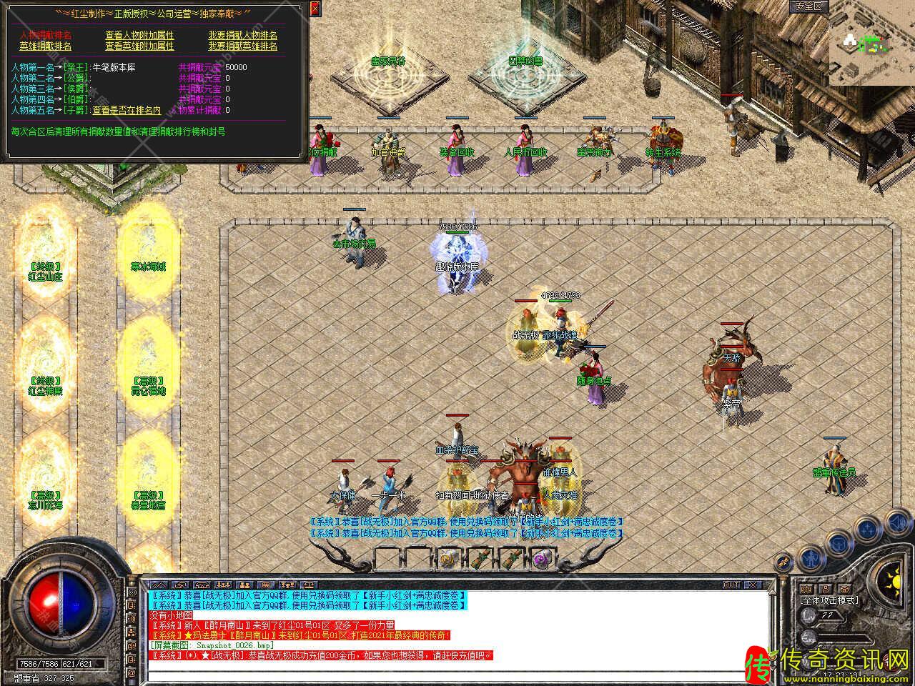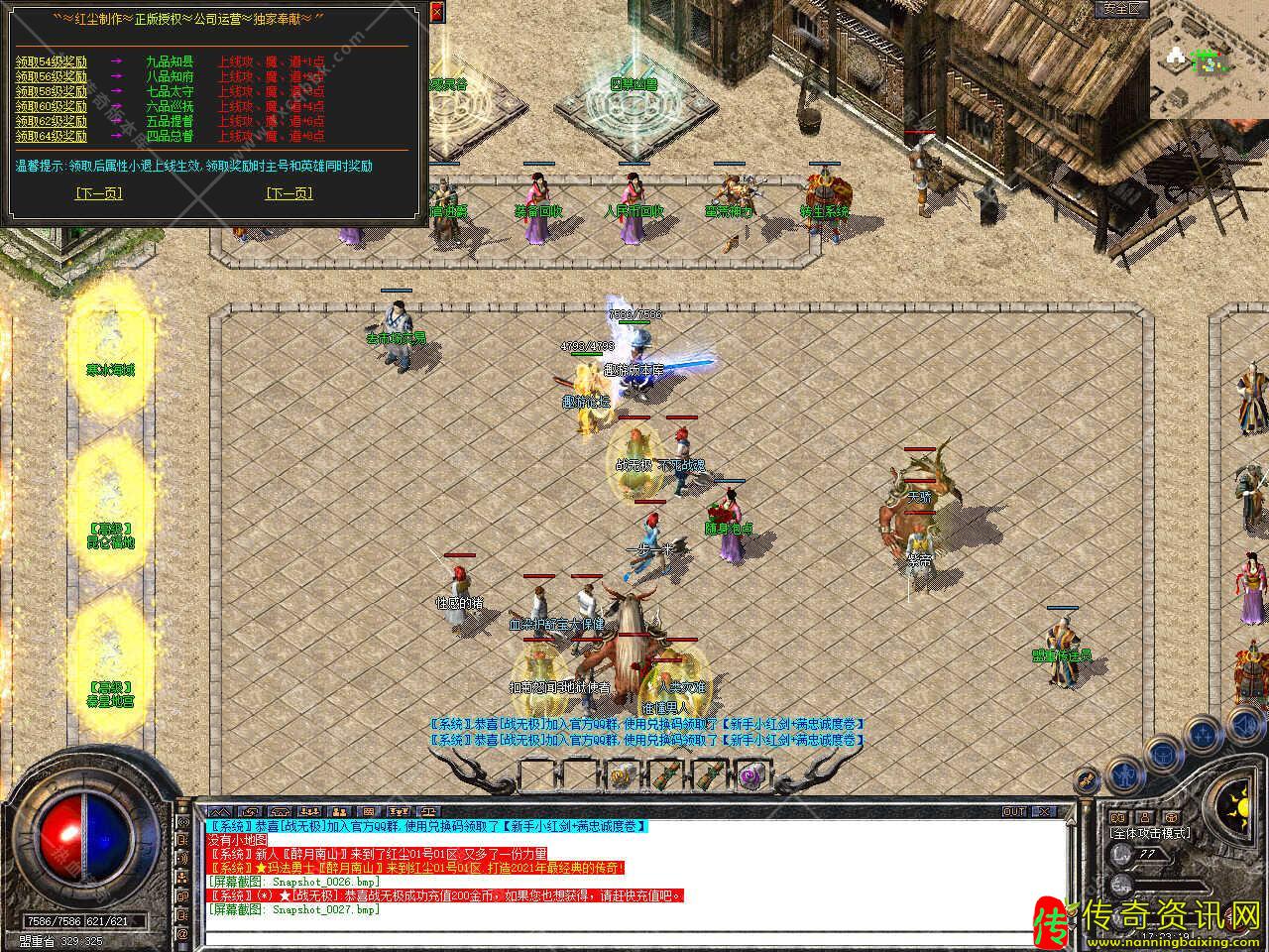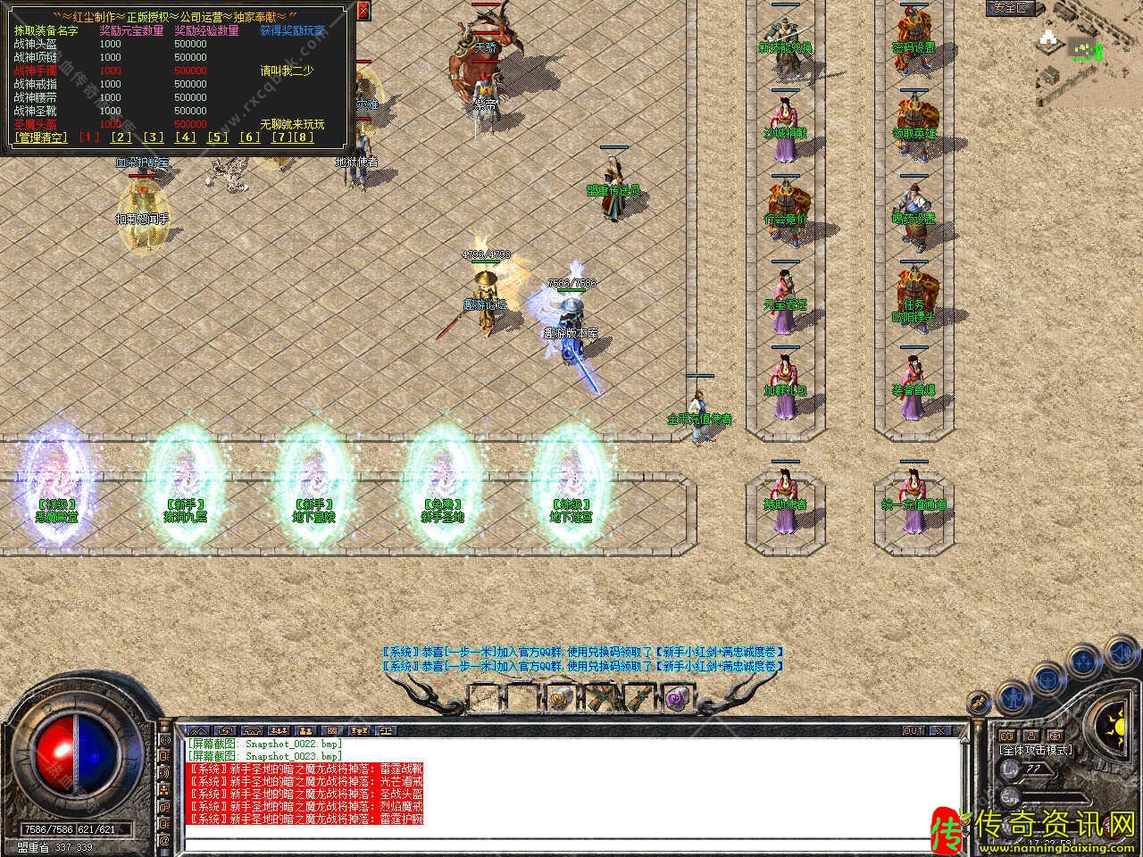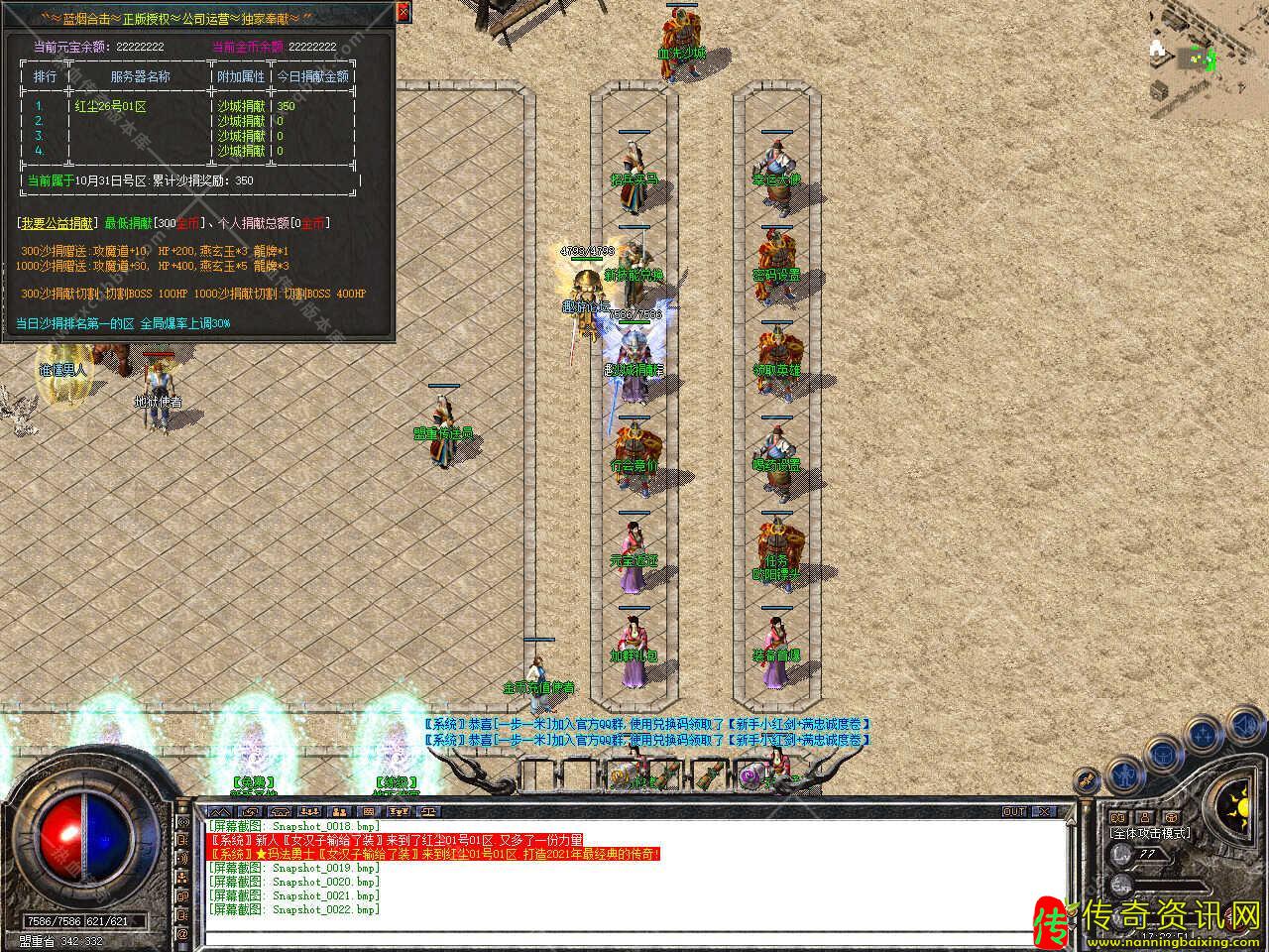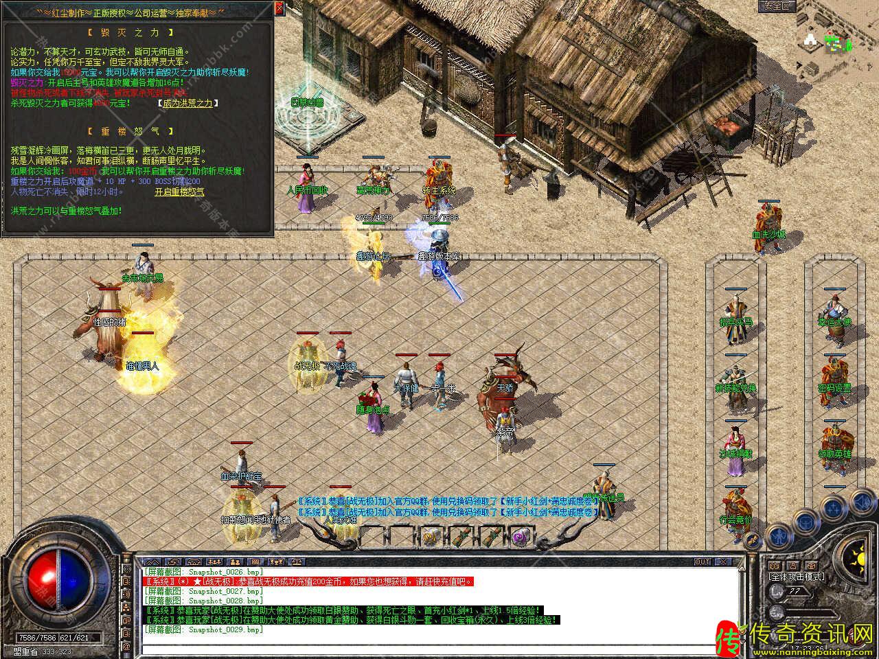版本介绍:新增多个活动,活动一、每三小时土药刷新树妖、可爆出大量装备、燕玄玉、龍牌等。活动二、每晚20点30活动大厅刷新生死判官、可爆出终极装备、神力碎片!活动三、每晚22点30忘川花海72,53刷新神兽boss,打掉此BOSS可解除漠南清源被封印的天外魔王boss,爆率极高。