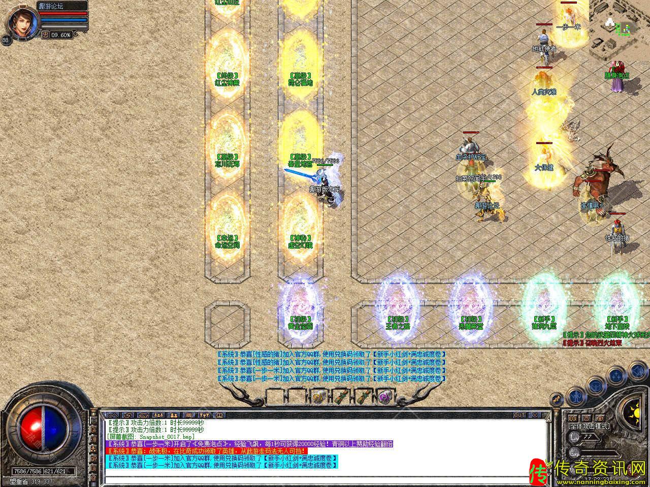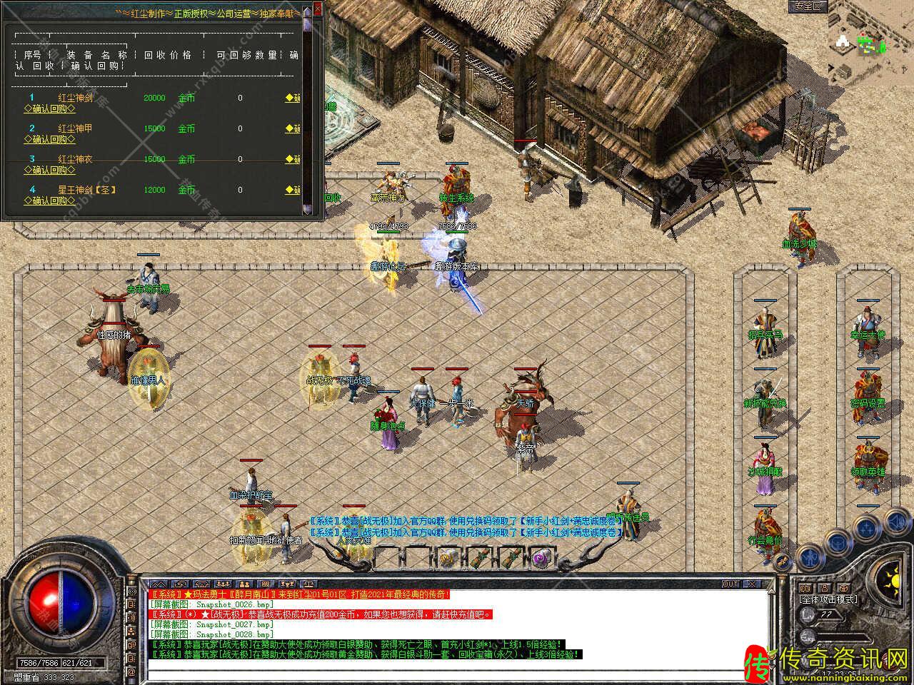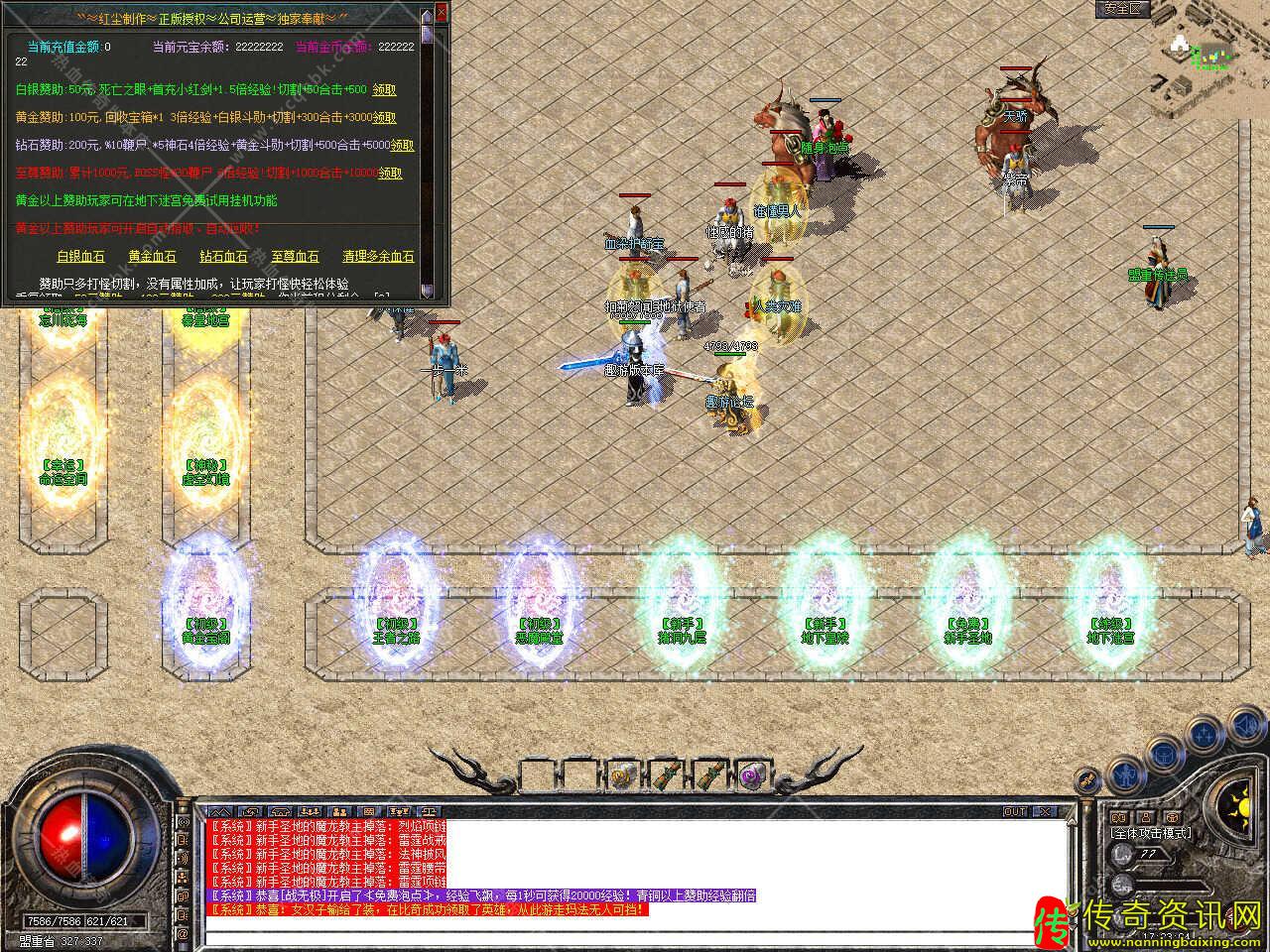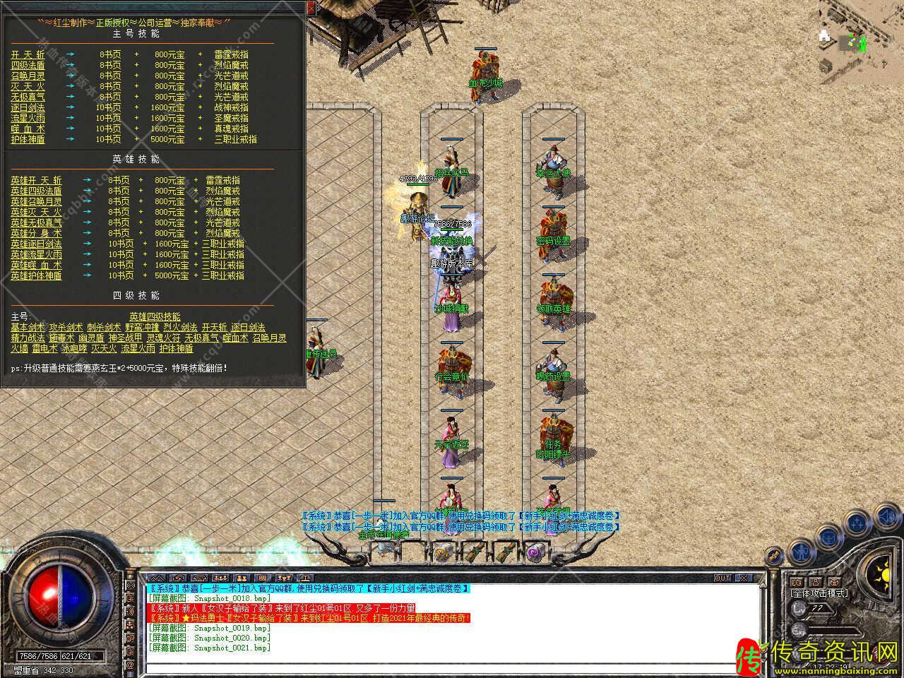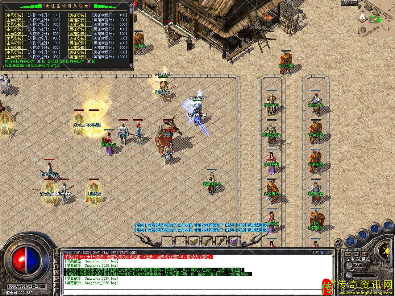 版本介绍:新增多个活动,活动一、每三小时土药刷新树妖、可爆出大量装备、燕玄玉、龍牌等。活动二、每晚20点30活动大厅刷新生死判官、可爆出终极装备、神力碎片!活动三、每晚22点30忘川花海72,53刷新神兽boss,打掉此BOSS可解除漠南清源被封印的天外魔王boss,爆率极高。