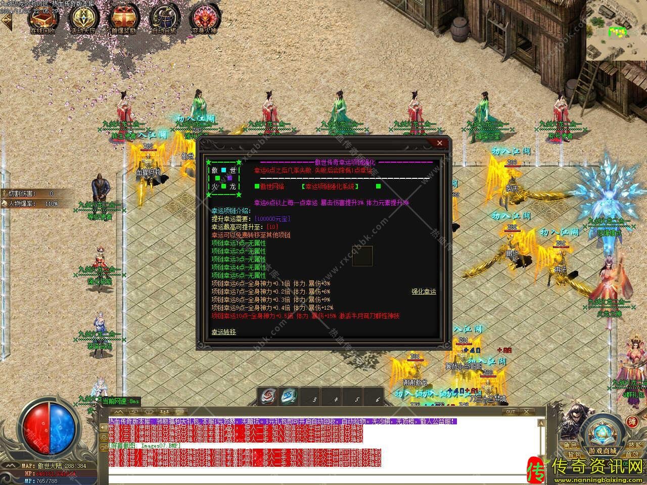 版本介绍:新增幸运项链强化系统,幸运6点以上每一点幸运,暴击伤害提升3%,体力元素提升3%,提升幸运需要100000元宝,幸运最高可提升至10,运可以免费转移至其他项链,项链幸运6点-全身神力+0.1倍,项链幸运9点-全身神力+0.4倍,项链幸运14点-打怪切割伤害+75000/,项链幸运15点-打怪切割伤害+100000。