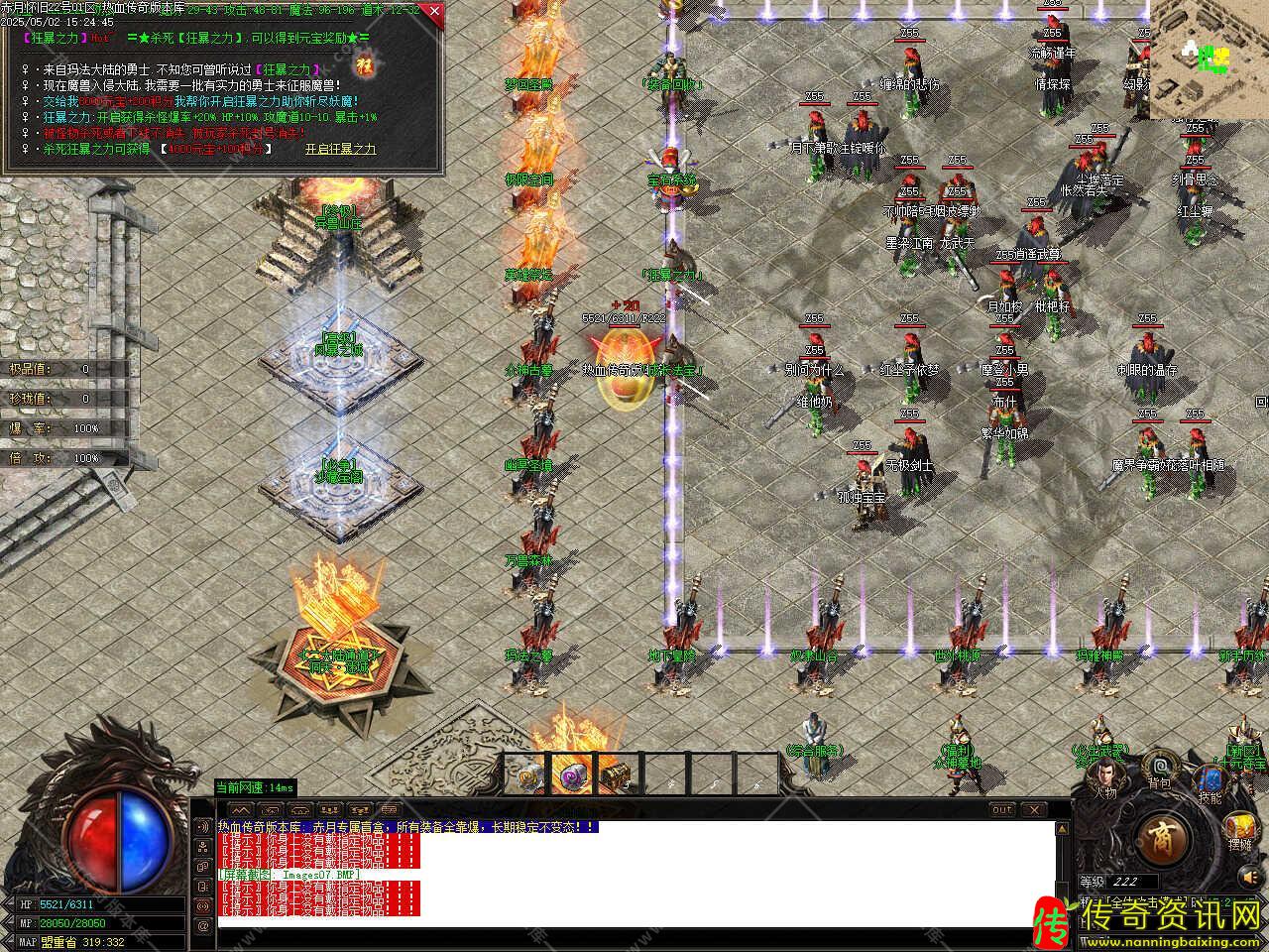 版本介绍:此传奇版本共刷新[洪荒,昊天,圣皇,伏羲]四大野外BOSS,刷新时间请关注土城(335,344)处的NPC,野外BOSS的爆率是地图BOSS的,游戏材料,高阶装备,书页元宝,是玩家必抢BOSS。