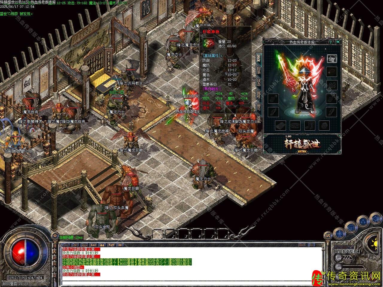 七、新增装备升级功能,装备升级全部100%成功,衣服:攻击-魔法-道术-防御-魔防各升7,,6000元宝升1点;首饰:攻击-魔法-道术-各升3点,6000元宝升1点;武器:攻魔道各升7点,6000元宝升1点,准确升7点,10000元宝升1点,请注意:请佩戴好装备再进行升级。