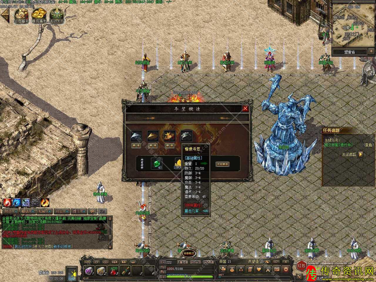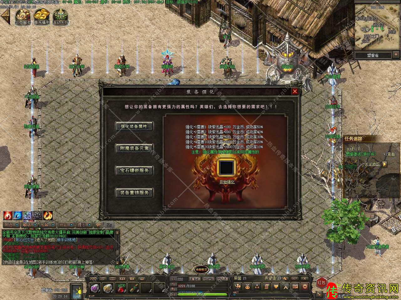 五.添加武器升级功能,你像是想要升级你的武器,不同武器升级要求不同,一般升级需要1000万金币,升级武器需要原料黑铁矿石和元宝,武器一共可以升级15次,每次需要5个20纯度以上的黑铁矿石,每次升级增加1点攻击、魔法和道术(按玩家职业升级),成功率100%。