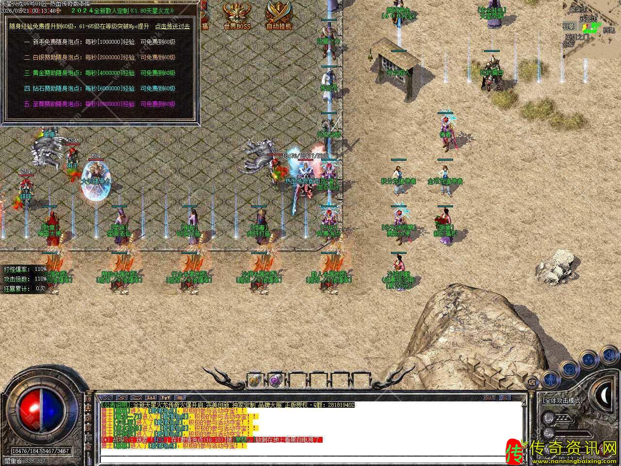 二.为方便新手升级,新增在线泡点功能,随身经验免费提升到60级,61-65级在等级突破Npc提升,新手免费随身泡点每秒1000000经验,白银赞助随身泡点每秒2000000经验,黄金赞助随身泡点每秒4000000经验,钻石赞助随身泡点每秒6000000经验,至尊赞助随身泡点每秒8000000经验值,可免费到60级。