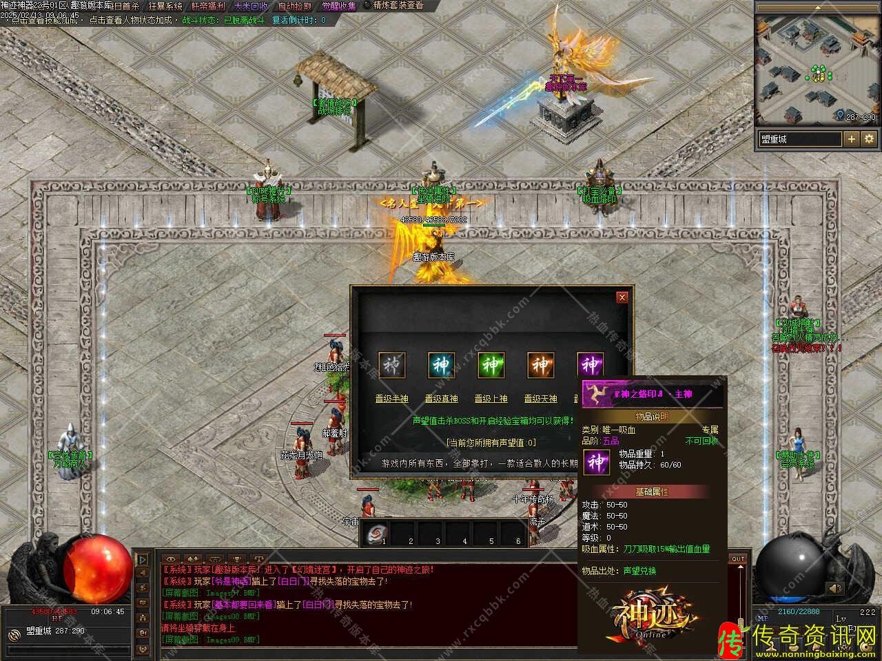 版本介绍:此热血传奇私服服务端最高等级前100级都需要打怪获得经验卷提升!后120级需要进入<埋没之城四大陆>提升,本服开通<青铜>赞助以上都会赠送紫装鉴定几率!玩家打到装备后自动鉴定装备品级从而获得不同的属性。