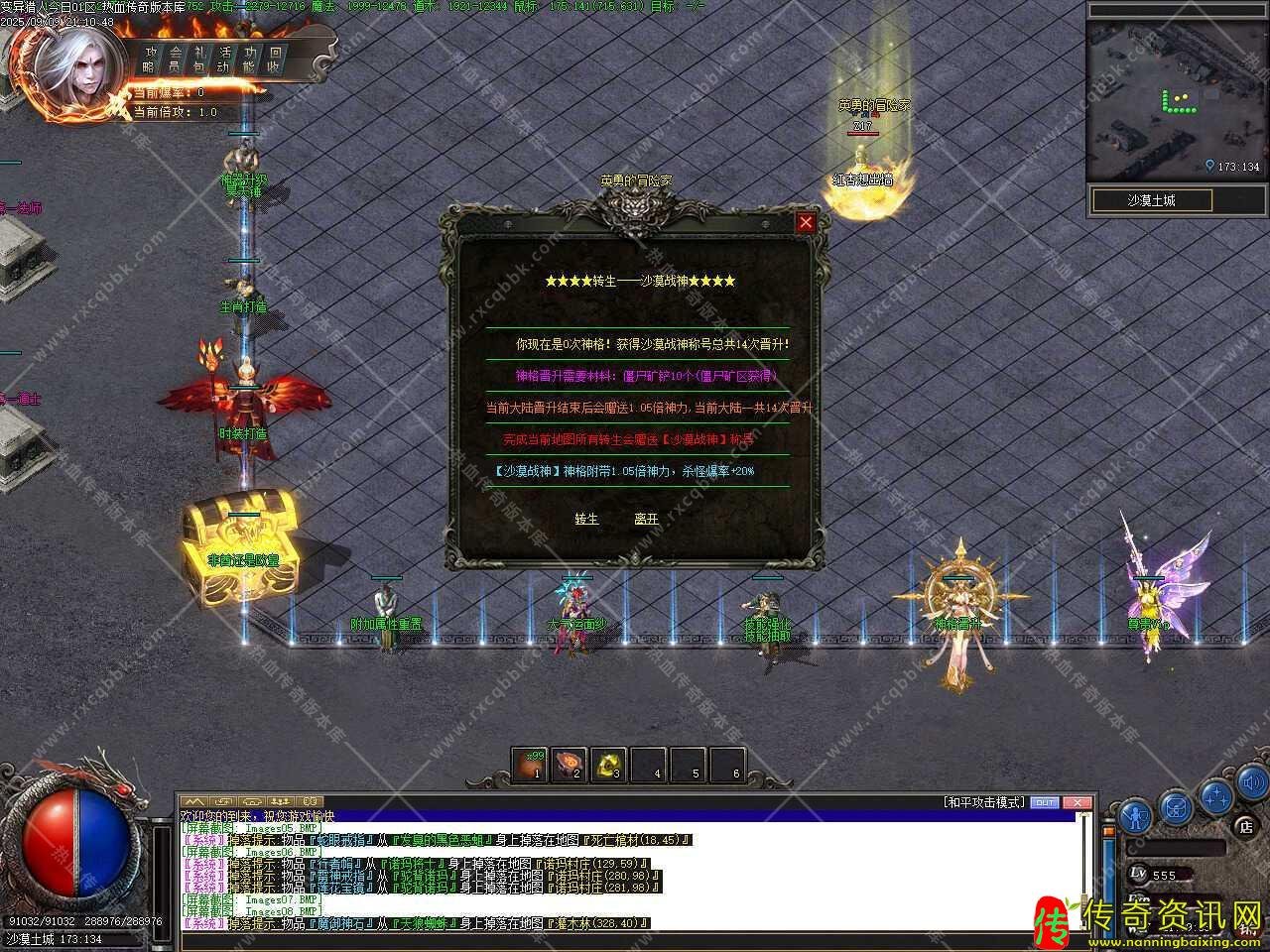 三、新增装备变异功能,变异规则:相同2件没有变异的装备可以在我这里变异,首饰盒,生肖,特殊4格不可变异.只能变异图片显示的装备.3种变异方法如下:【免费变异】2个相同的装备+30个变异石+600荣誉点,成功率40%。失败装备破碎消失。【金币变异】2个相同的装备+40个变异石+5000W金币+1200荣誉点,成功率65%。失败装备破碎消失。【元宝变异】2个相同的装备+50个变异石+15000元宝+2000荣誉点,成功率100%。不会失败。注:装备变异后【初始属性*2,隐藏属性*2,套装属性*2】!装备变异后扔地上重新拾取后就有鉴定属性!