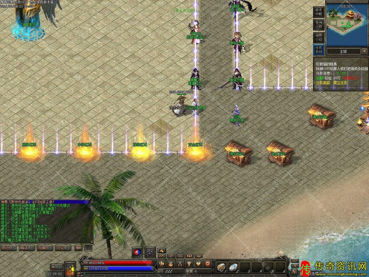 版本介绍:新手上线创建好角色,进入游戏首先来到的是新手村1,按游戏界面左上角的任务按钮,找到主线任务的要求,打相应的怪,打几个怪就升到8-9级了,可以离开这个落后世界去比奇了,新手最好做一下这件事:先找一下福利发放使者,跟他要个福利,输入新手礼包码:by888,把小药都解开不占位置,药品都可以叠加99个,有了双倍经验卷,前期冲级不用愁。