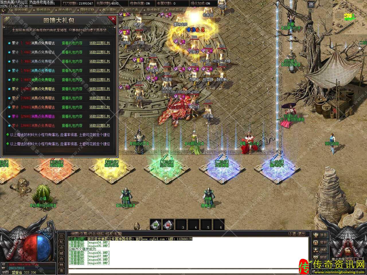 六.此版本每天四个新区,海量宣传,第二天下午合区,保证区区人气火爆,首次合区攻沙奖励999,月统战区奖励2999,更多游戏特色不在此介绍,请自行体验。