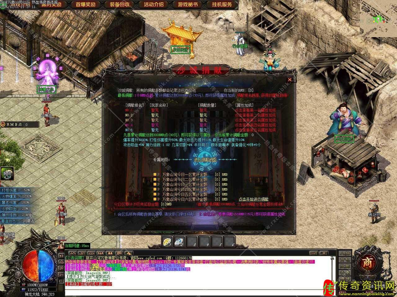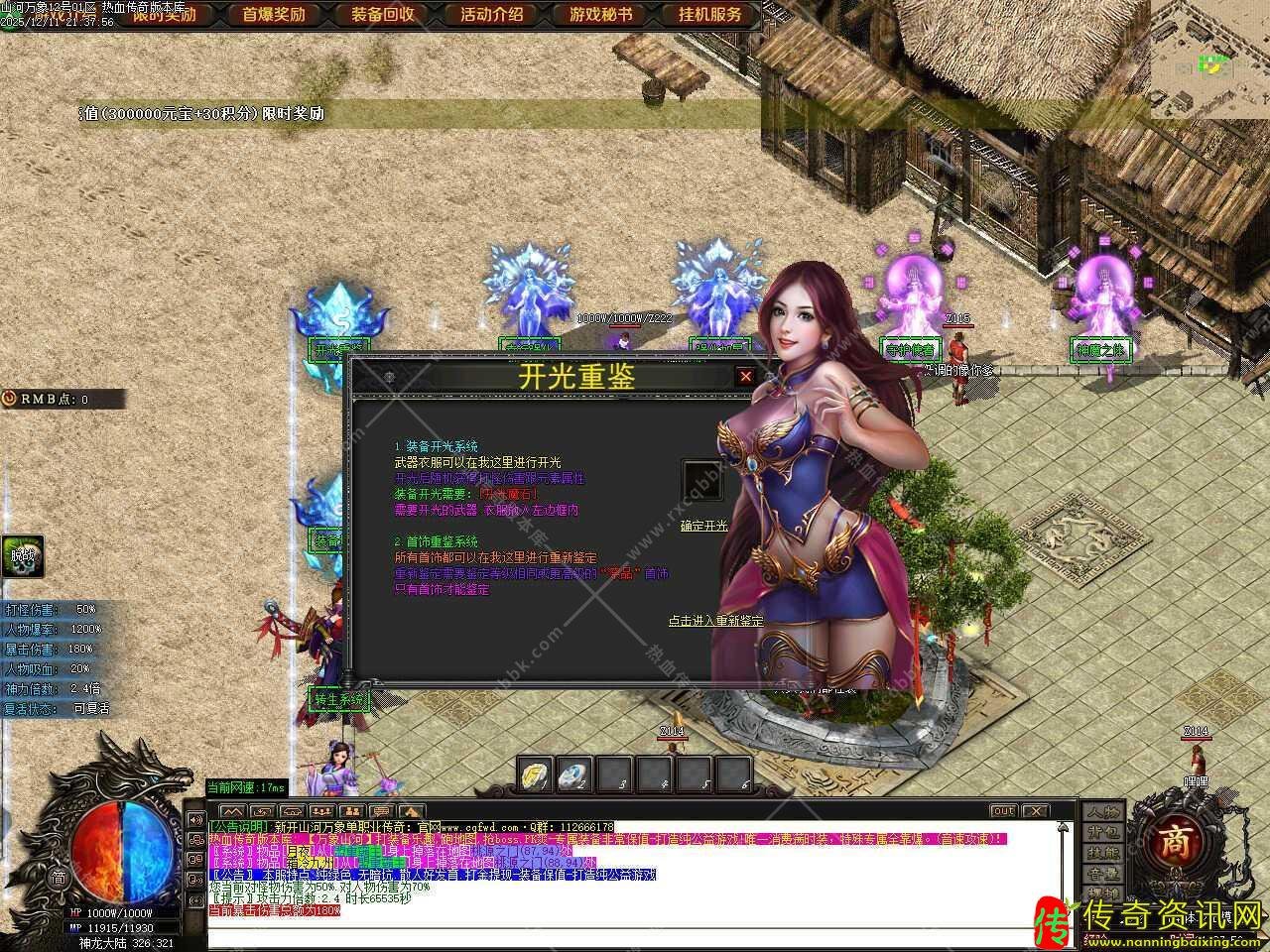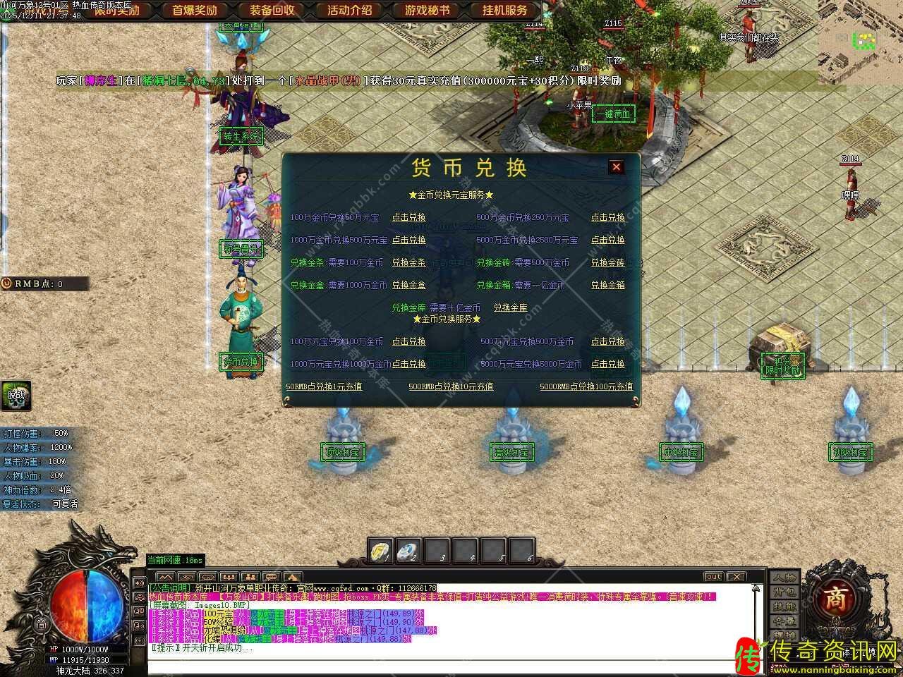 二.新增测试奖励功能,在测试区打到限时奖励获得的游戏点可以记录,记录不限制次数!记录1元限时开区后便可以获得10000元宝+1积分奖励,在测试区一定要在NPC那记录测试区限时,如无记录则开区无法领取。