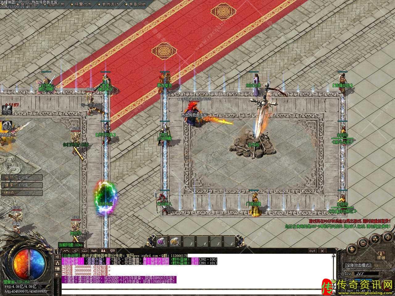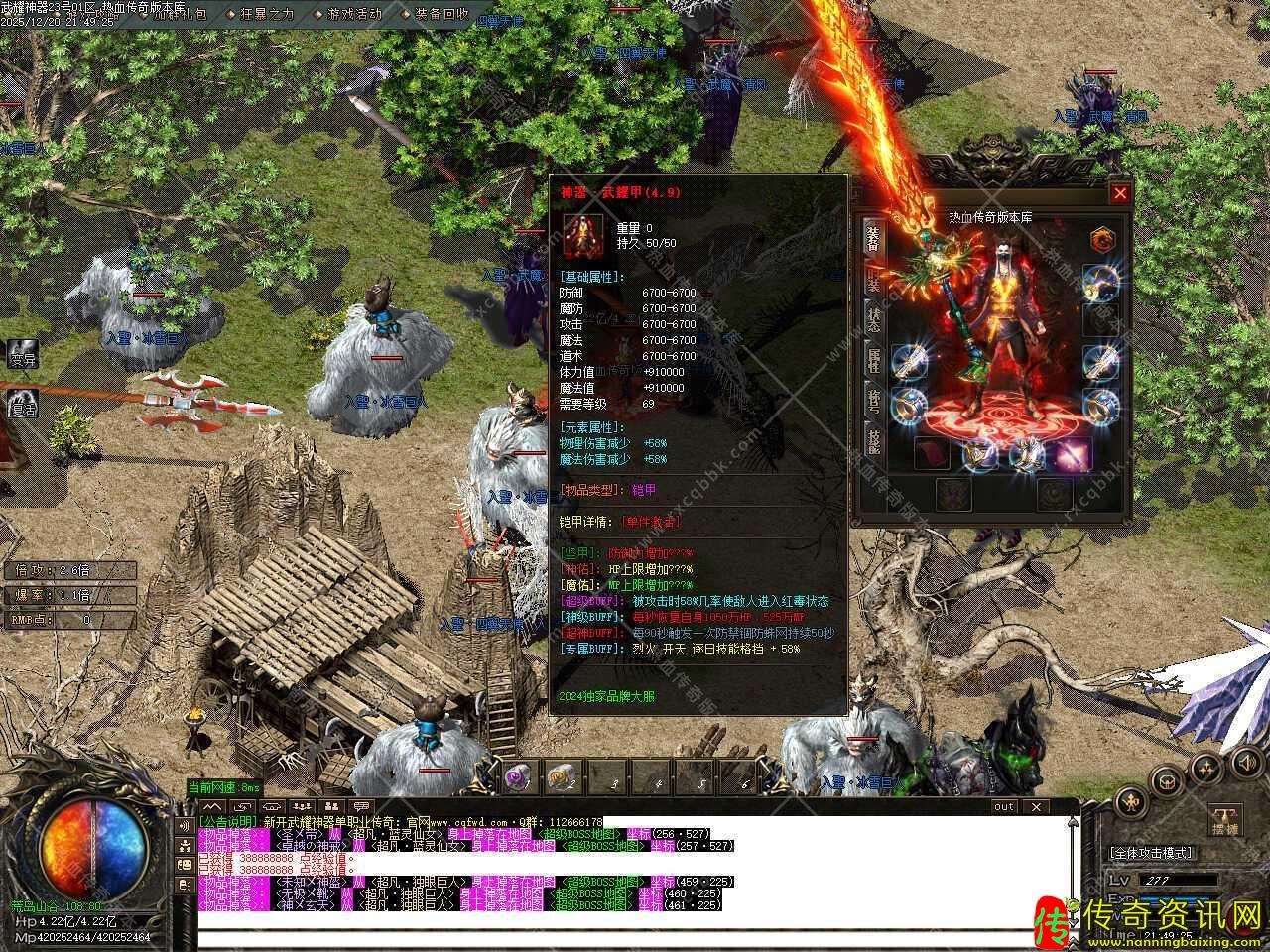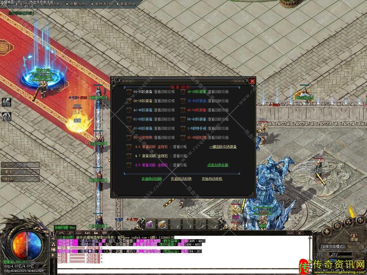 七.本服前期主要打装备回收元宝,打经验丹升级,升级到1100级以后可以进入终极大陆,终极大陆每个地图都会刷新一只武耀武僧[武耀专属]此怪物爆率超高,散人逆袭必打,所有红怪紫怪都有几率爆出终极-5.0套。