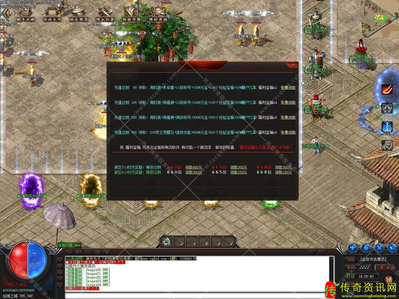 新区开区一小时开启全服boss活动,全民都来打小怪兽,全服boss活动每隔一个小时触发一次,持续六个小时,共刷新17只小怪兽,3只大怪兽,可爆全服所有装备,爆率超高,3只大怪兽1只必爆26以上所有装备,1只必爆2万点卷,1只必爆经验宝箱100个和各种材料。