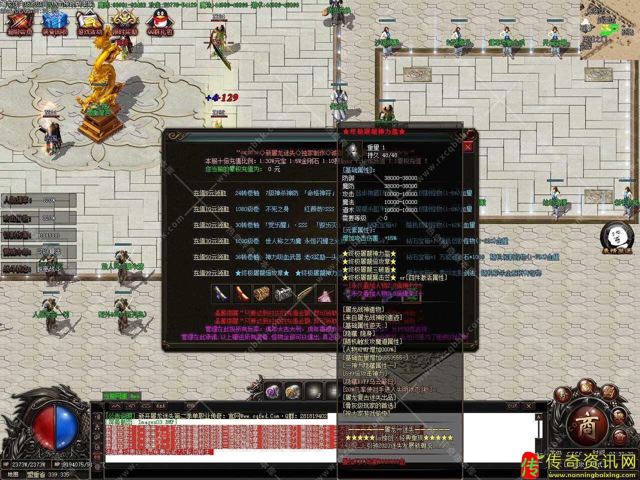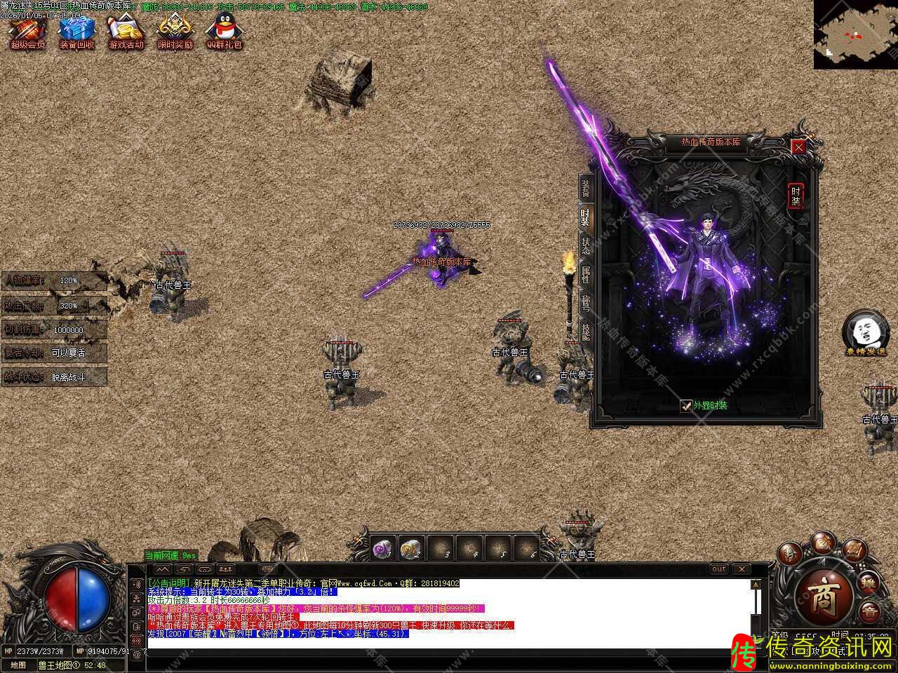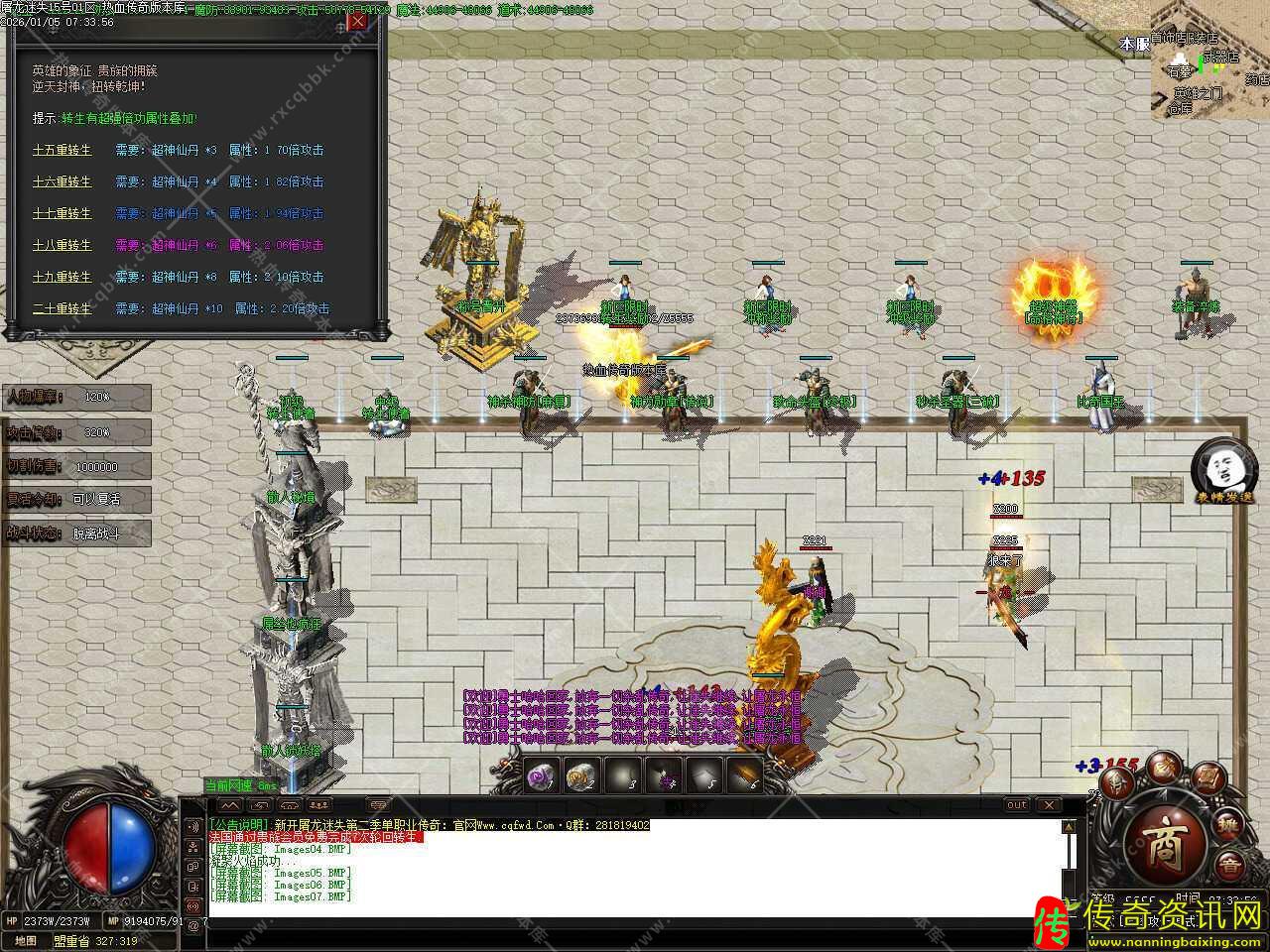 二.更新转生到55转,55转召唤5只终极GM随宠,轻松打全服所有的BOSS怪物,还更新了一大陆所有地图刷新必爆游戏点怪,1小时刷新一次,散人玩家的福利。