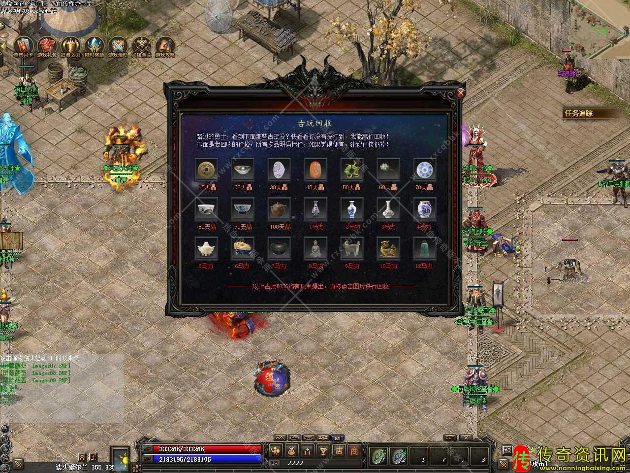 六.因为此版本有多个职业,新增种族材料互换、宝箱兑换、宠物技能兑换和职业进阶石兑换等功能,兑换注意事项:种族材料一换一需要10000历练金币,点找npc把要兑换的材料放背包,不用兑换的种族材料存仓库,点击图标,确定要互换的材料,再点击【一换一】按钮兑换。