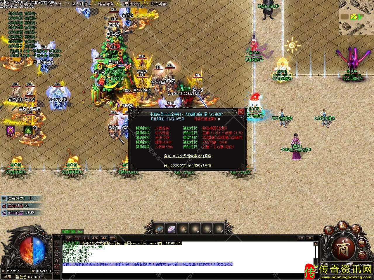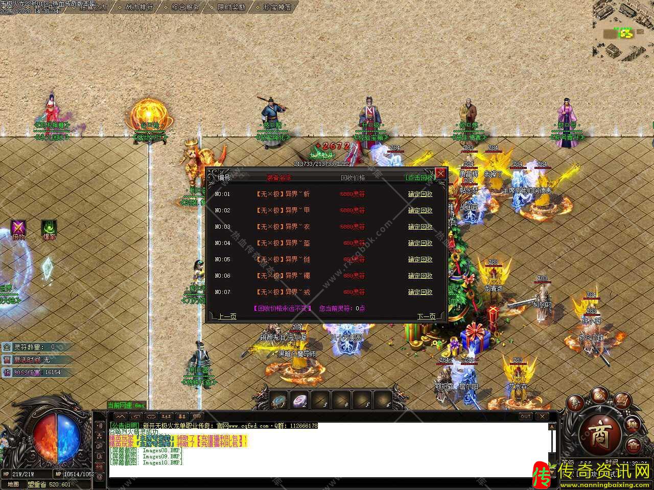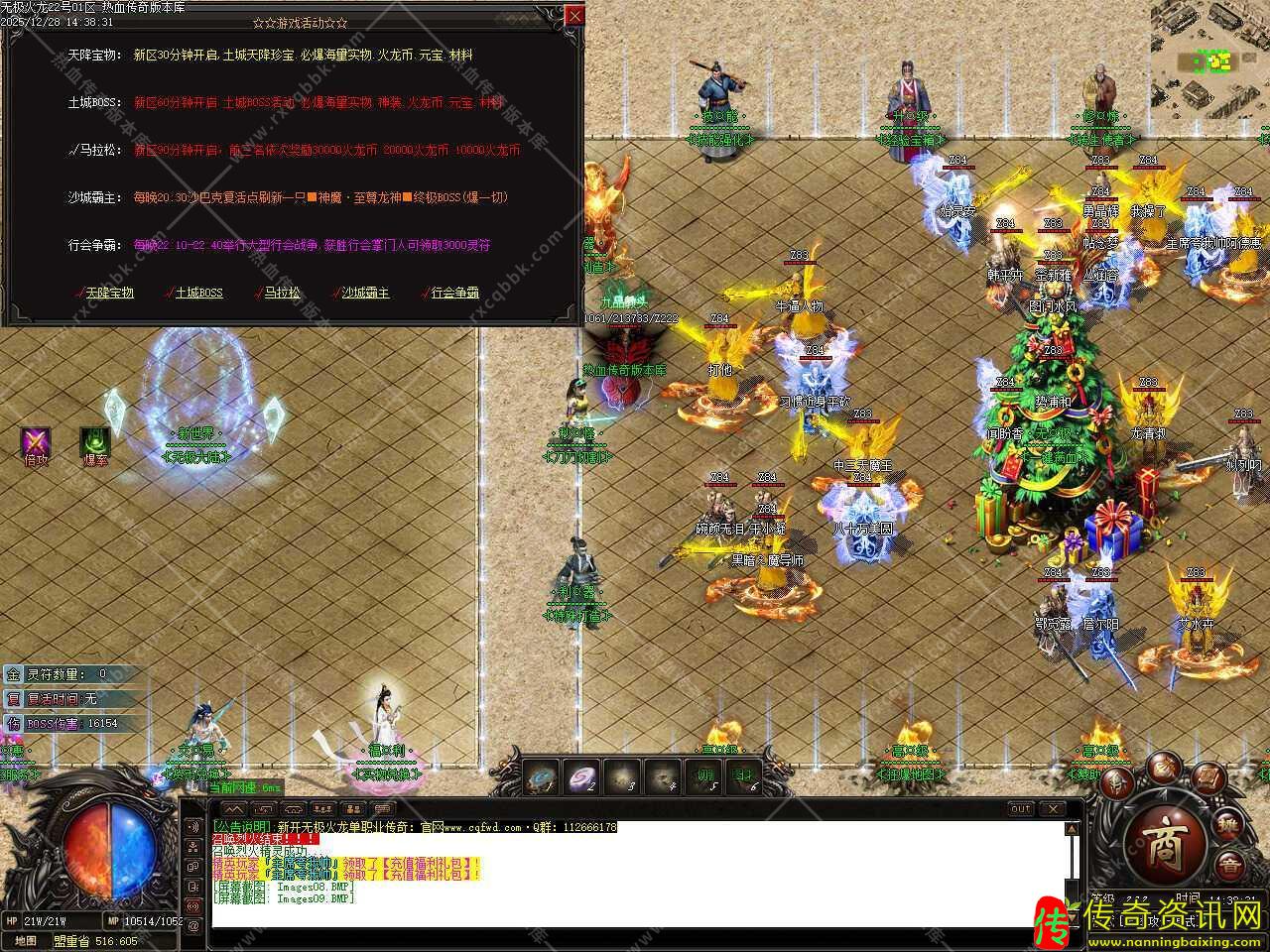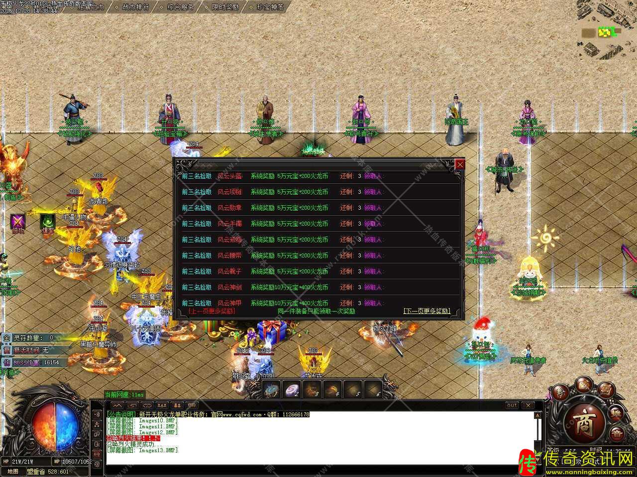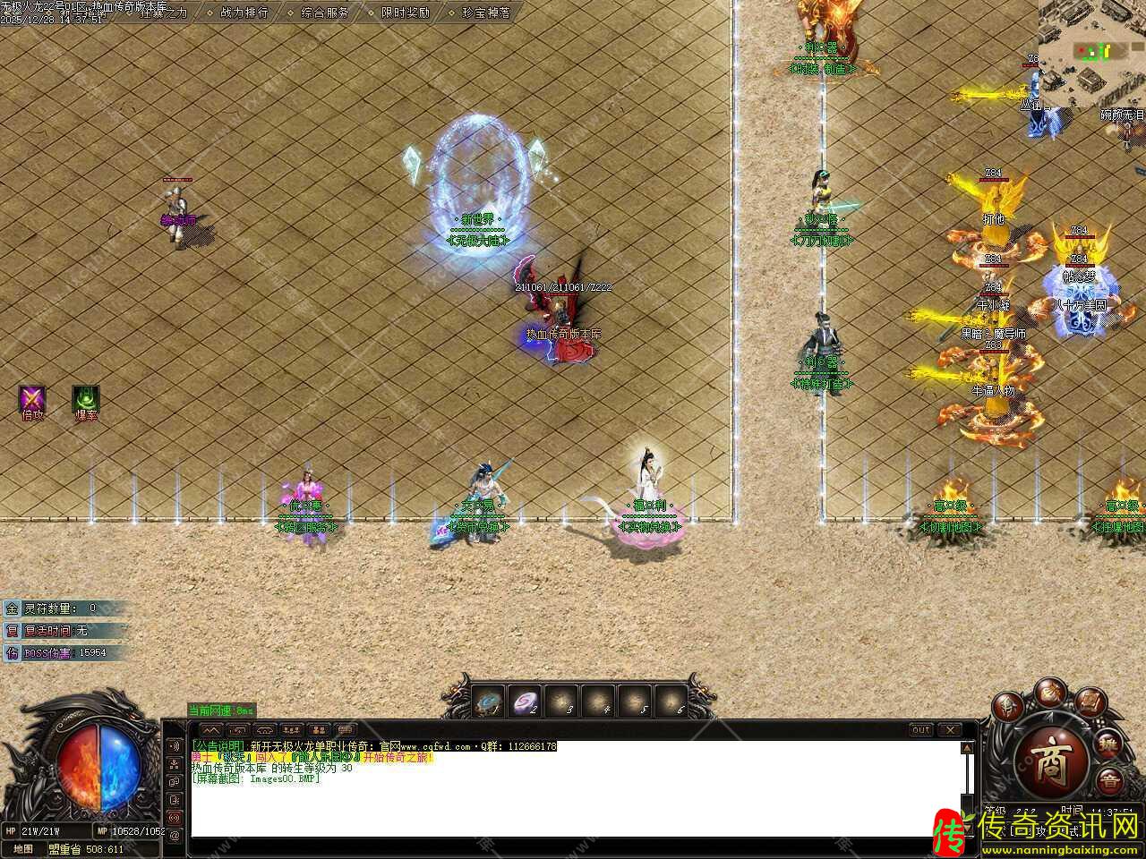 四.此版本新增多个活动,新区30分钟开启天降宝物,土城天降珍宝,必爆海量实物、火龙币、元宝和材料;新区60分钟开启土城BOSS,必爆海量实物、神装、火龙币、元宝和材料;每晚20:30沙巴克复活点刷新一只神魔至尊龙神终极BOSS(爆一切);每晚22:10-22:40举行大型行会战争,获胜行会掌门人可领取3000灵符。
